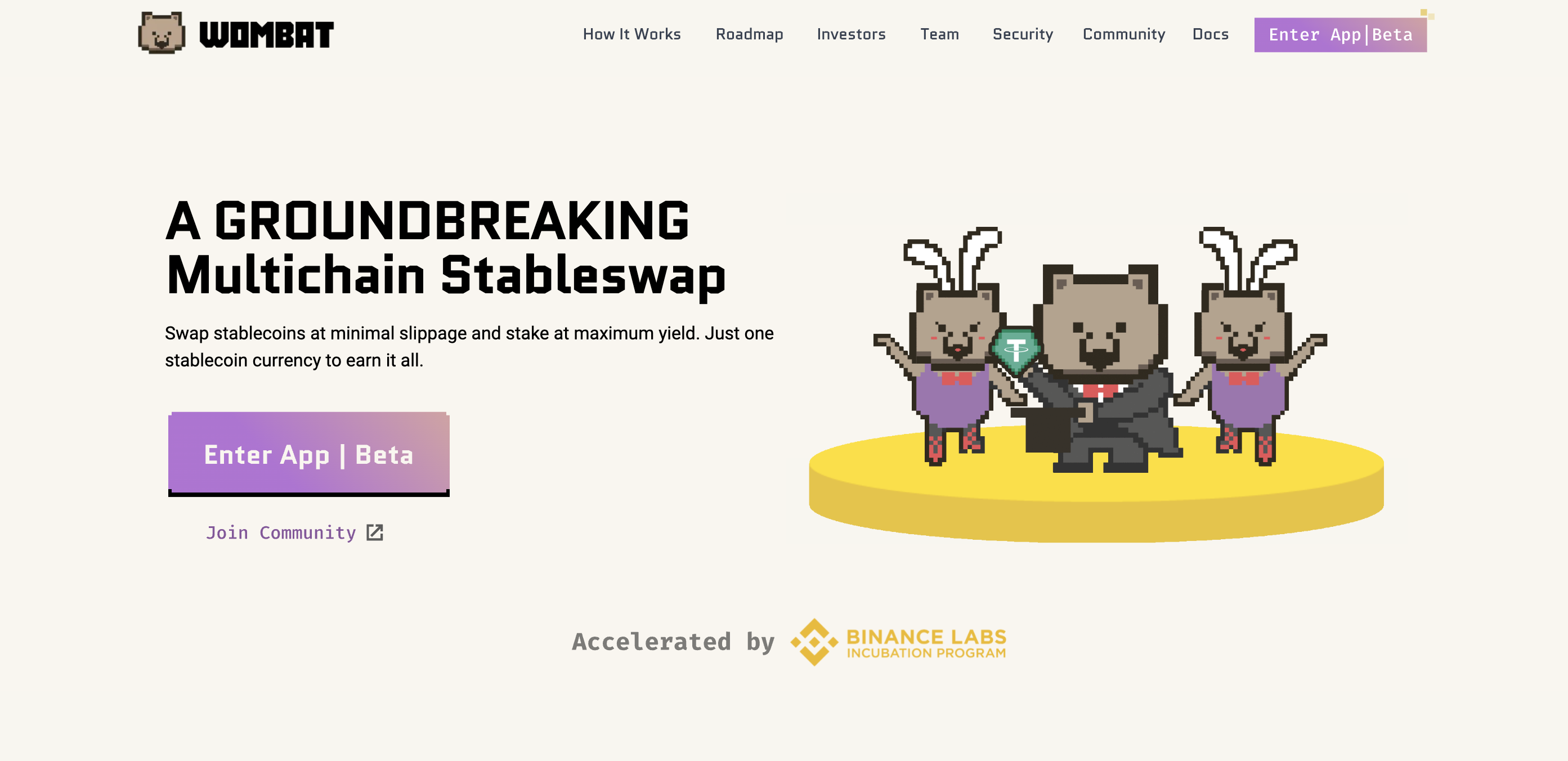 - Wombat Exchange - Mutlichain stableswap. Swap stablecoins at minimal slippage and stake at maximum yield. Just one stablecoin currency to earn it all