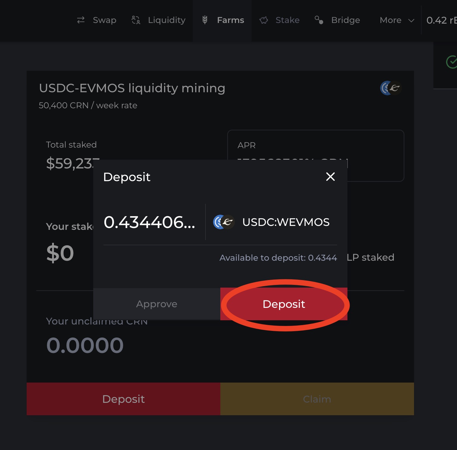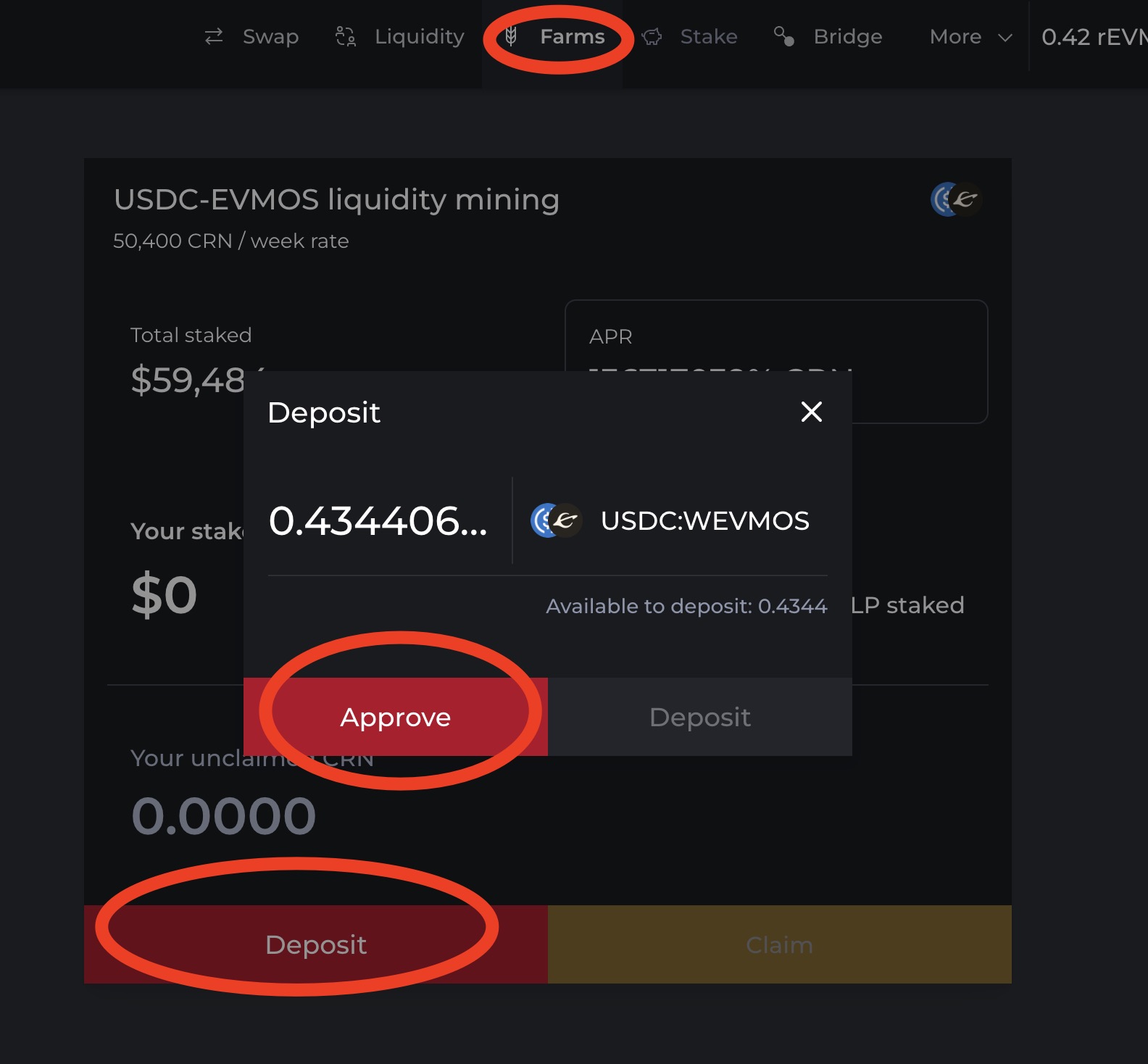 5,然后点击农场,选择货币对并输入金额点击批准后进行全部确认。批准成功以后继续点押金。
