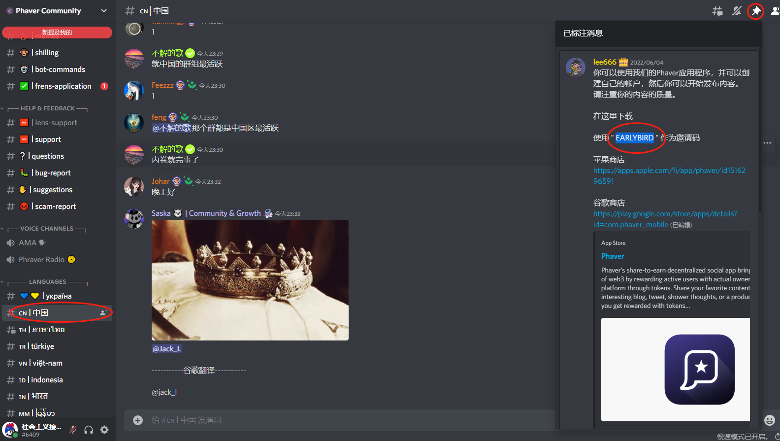 4,我们在discord的中国频道的钉选里面就可以找到邀请码。