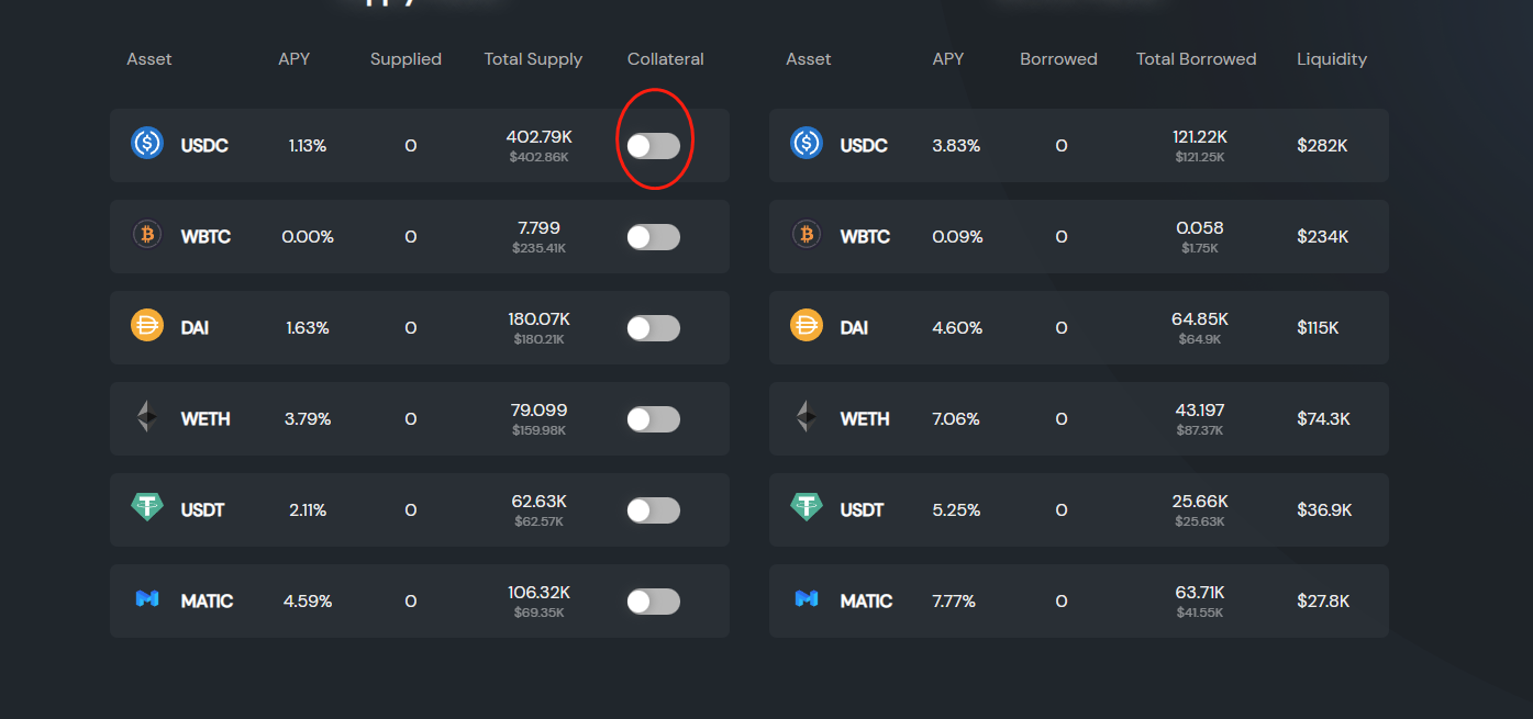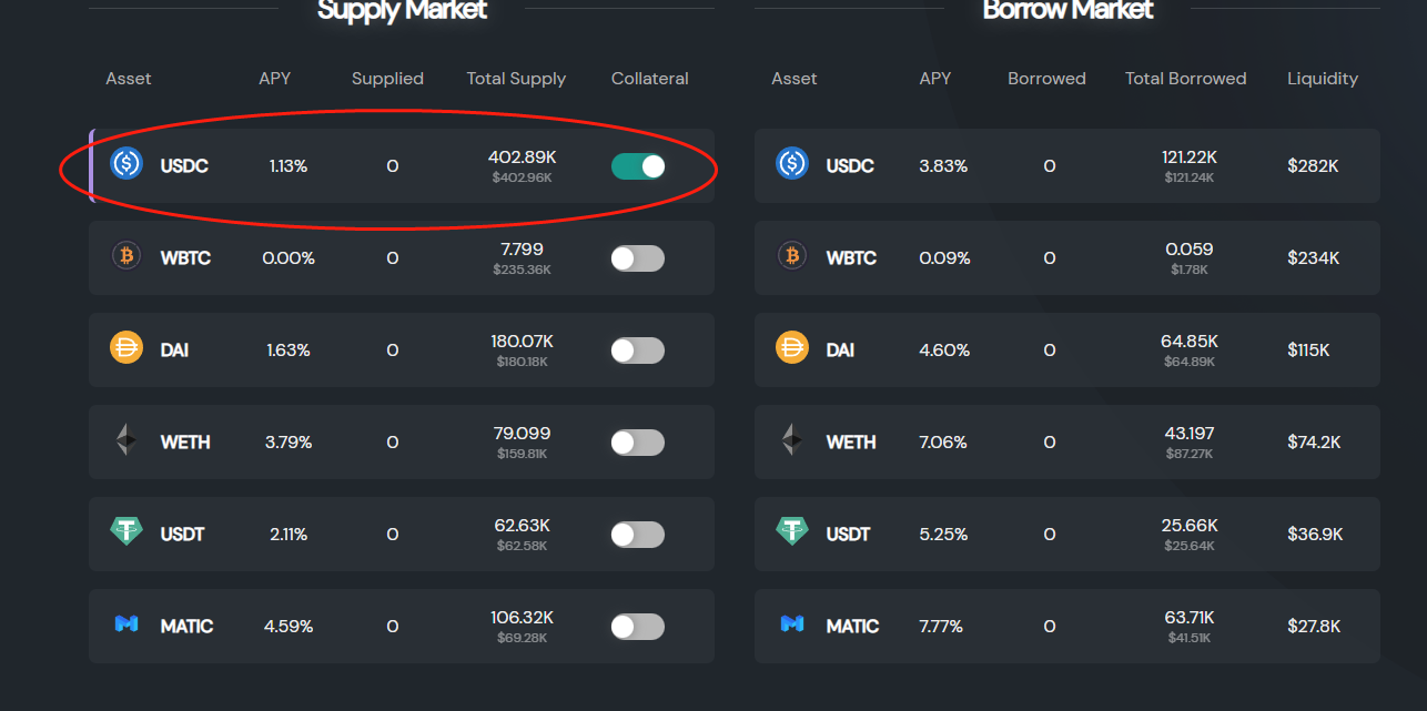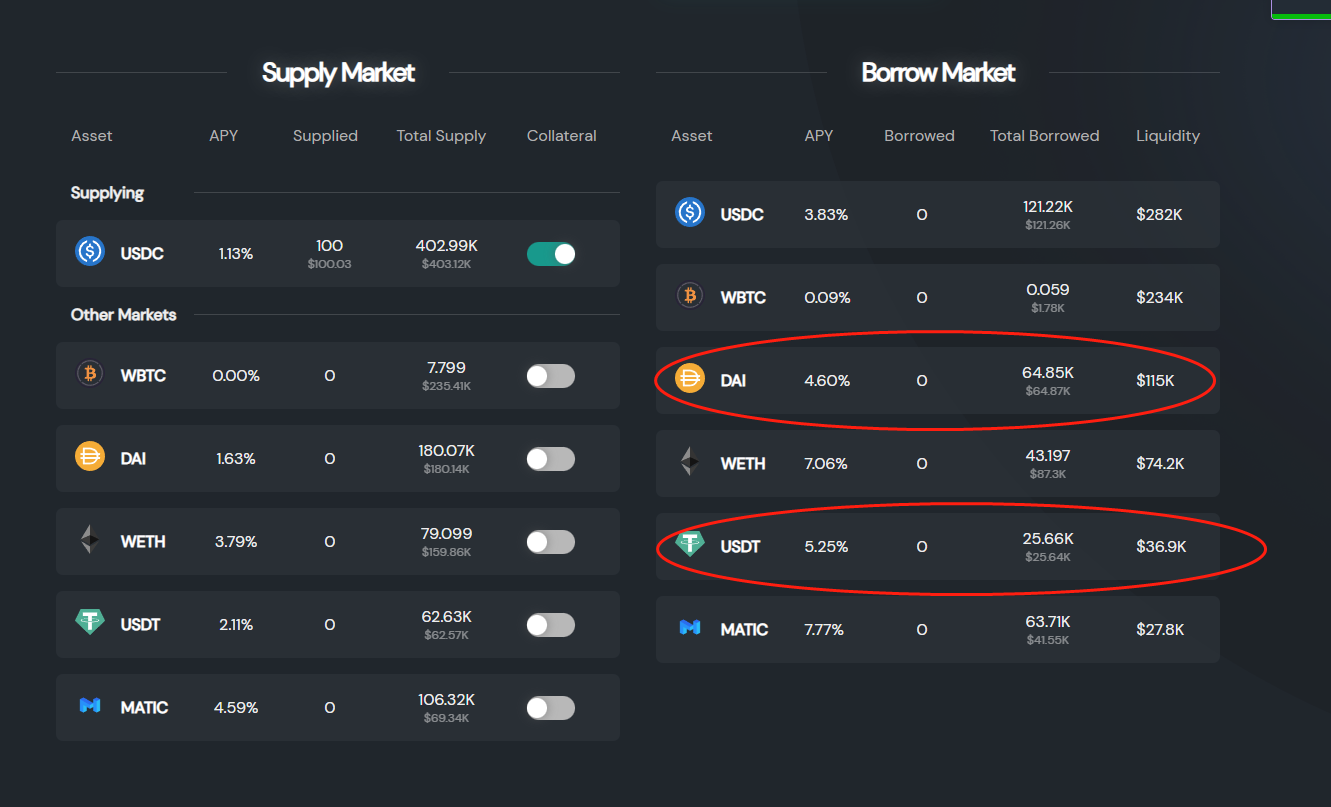 1,首先我做的就是稳定币,供应市场和贷款市场,所以我准备了100USDC和一点MATIC作为GAS费。如果你polygon里面没有USDC和MATIC可以用我们昨天用到的跨链桥继续使用跨过来一些币MATIC代币。