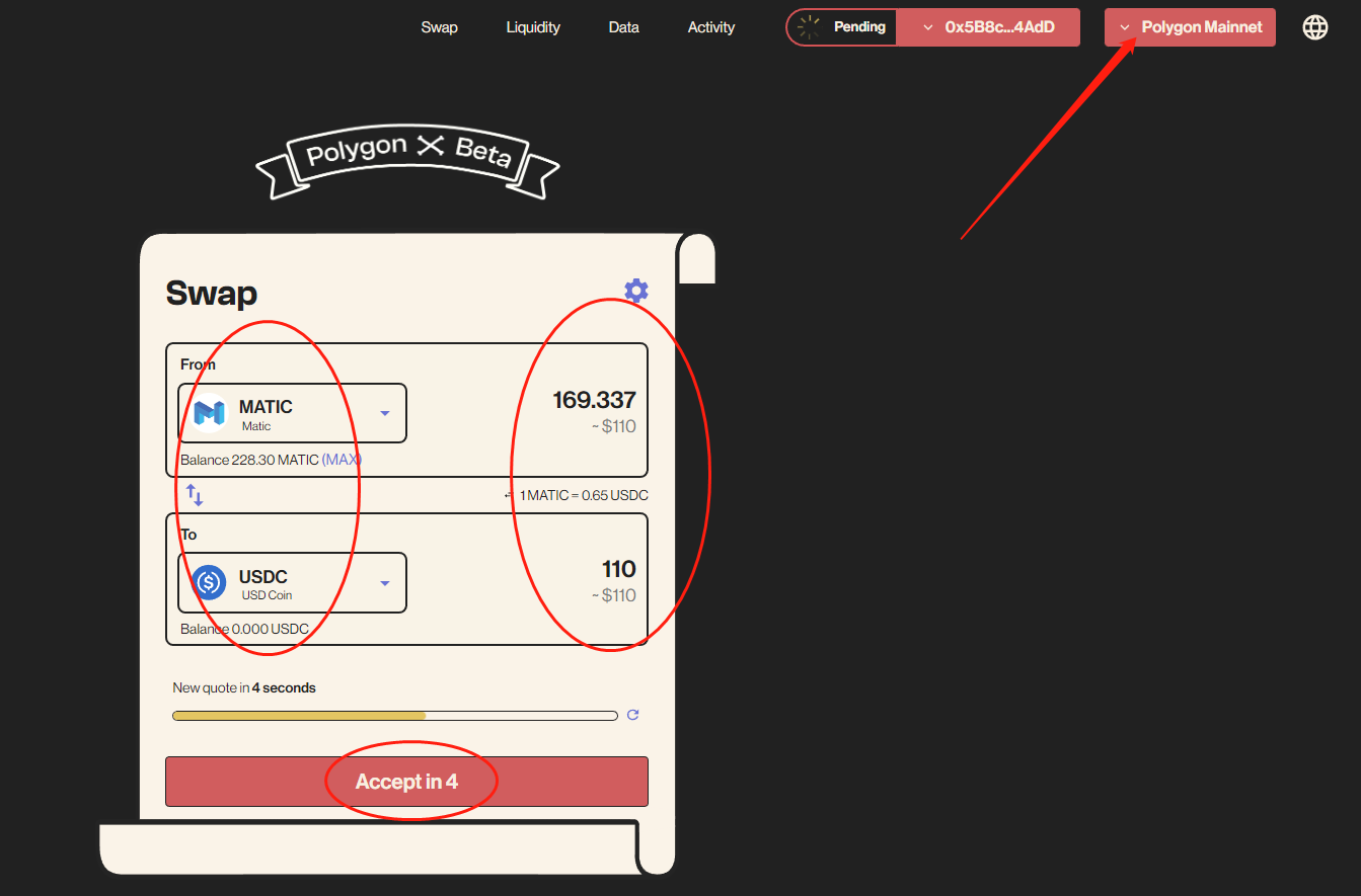 2,然后在clipper上面我们可以把跨链过来的MATIC兑换100个USDC一会备用。备注(空投埋伏),以后交易可以尽量用到。