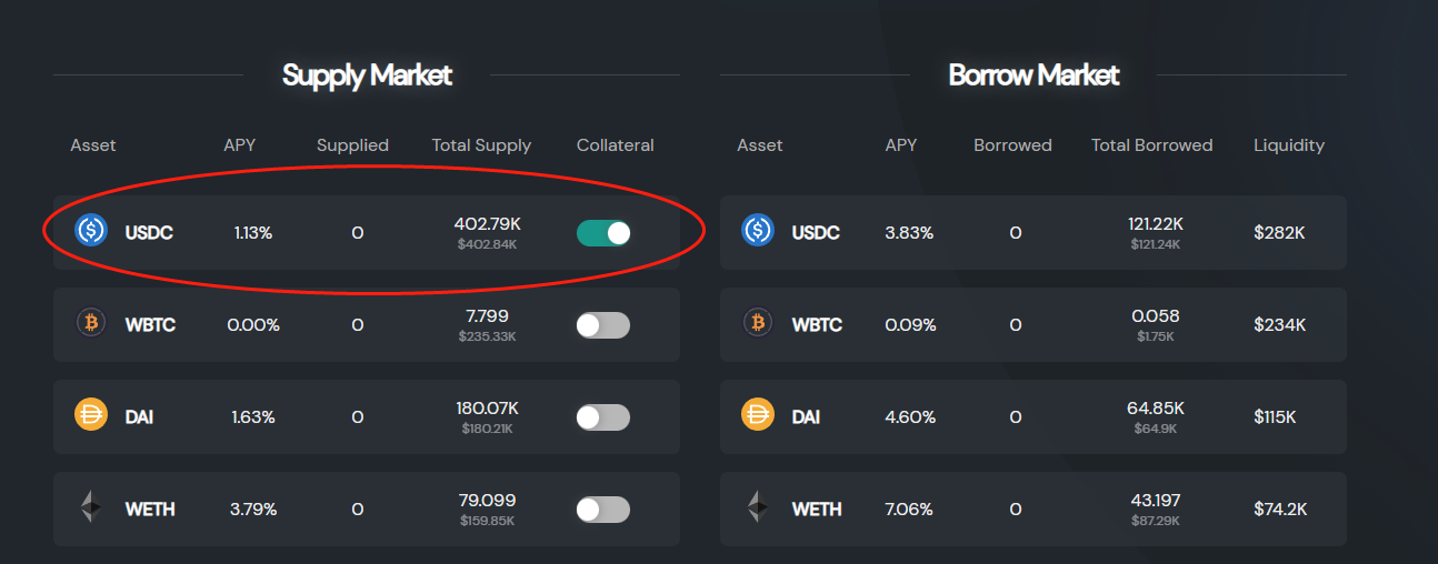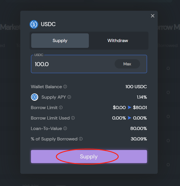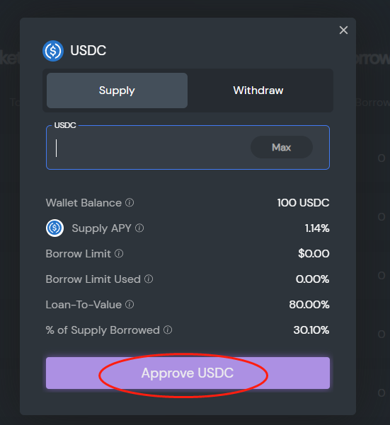 5,批准以后我们继续点击USDC,然后选择数量点击供应进行钱包确认即可。