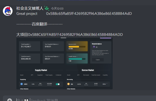 最后我们在discord中feedback频道可以说一句话一个截图或者一些建议并附加自己的钱包地址。
