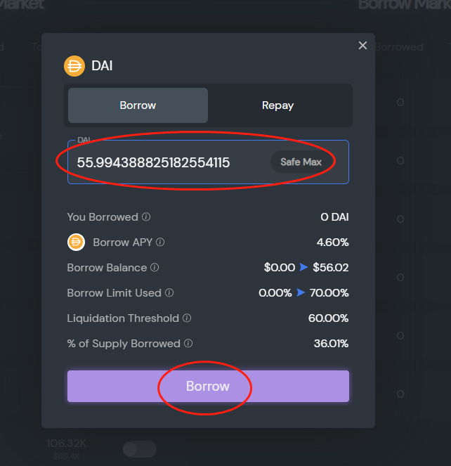 6,供应完以后我们随意找个稳定币借出,我选择的是DAI,可以借出金额会显示,然后点击借款并确认。(不要输入最大金额借款)