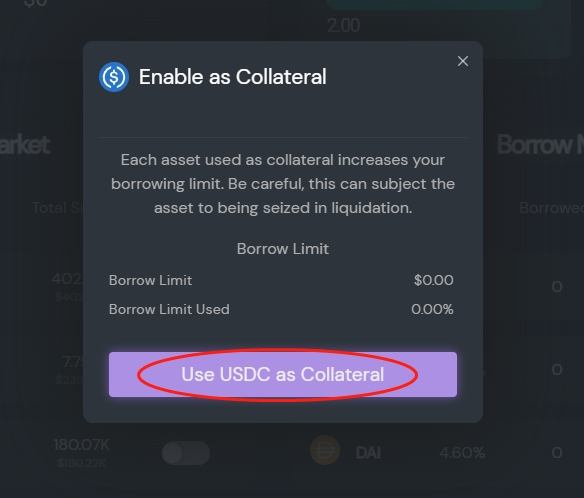 3,打开0VIX网址,并连接metamask钱包。下滑找到USDC后面的抵押品打开,然后点击使用USDC作为抵押品,并在钱包进行确认。
