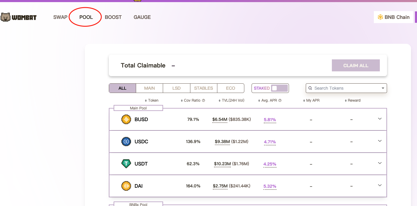 8,打开 Wombat Exchange并继续链接metamask钱包切换到BSC主网并点击pool