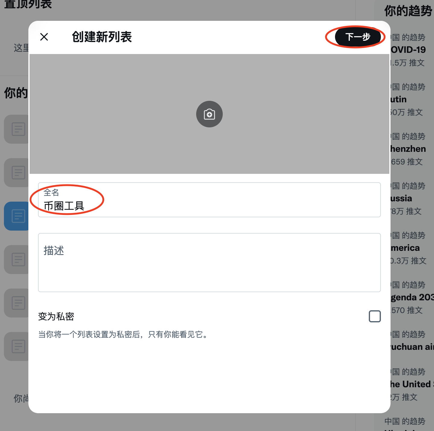 2,输入列表名称,比如创建的是 #币圈工具 列表,输入 #币圈工具 ,然后点击下一步,