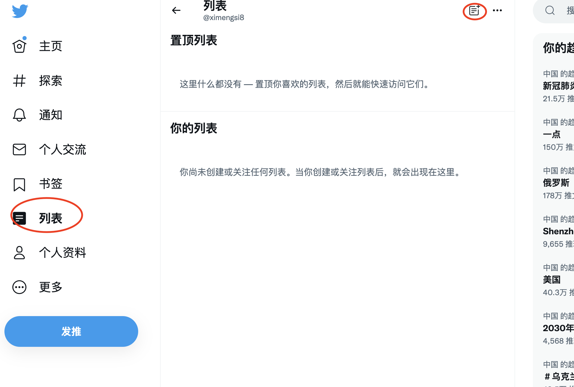 1,首先来到twitter主页面建立几个板块的列表,点击列表,然后点击右上角的➕号