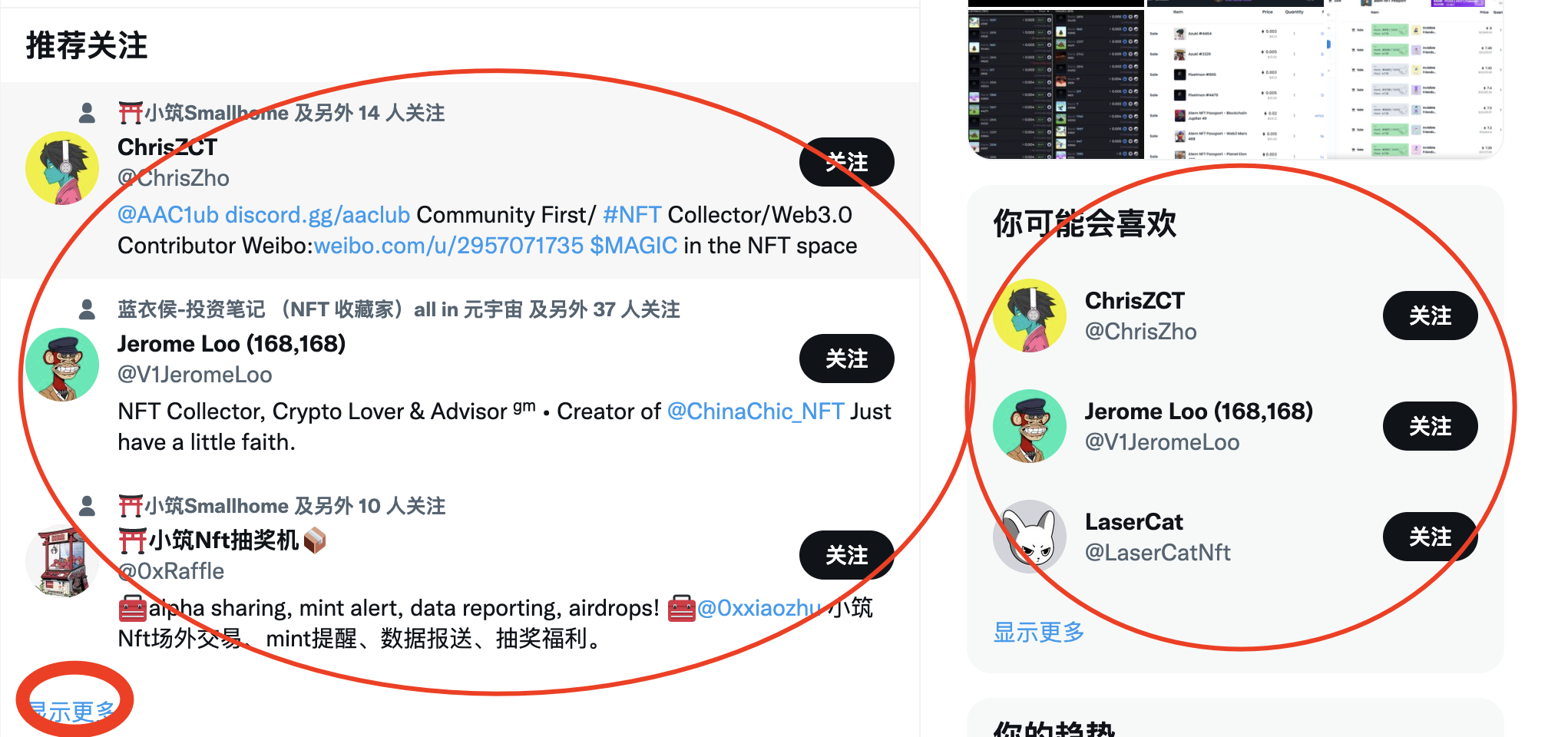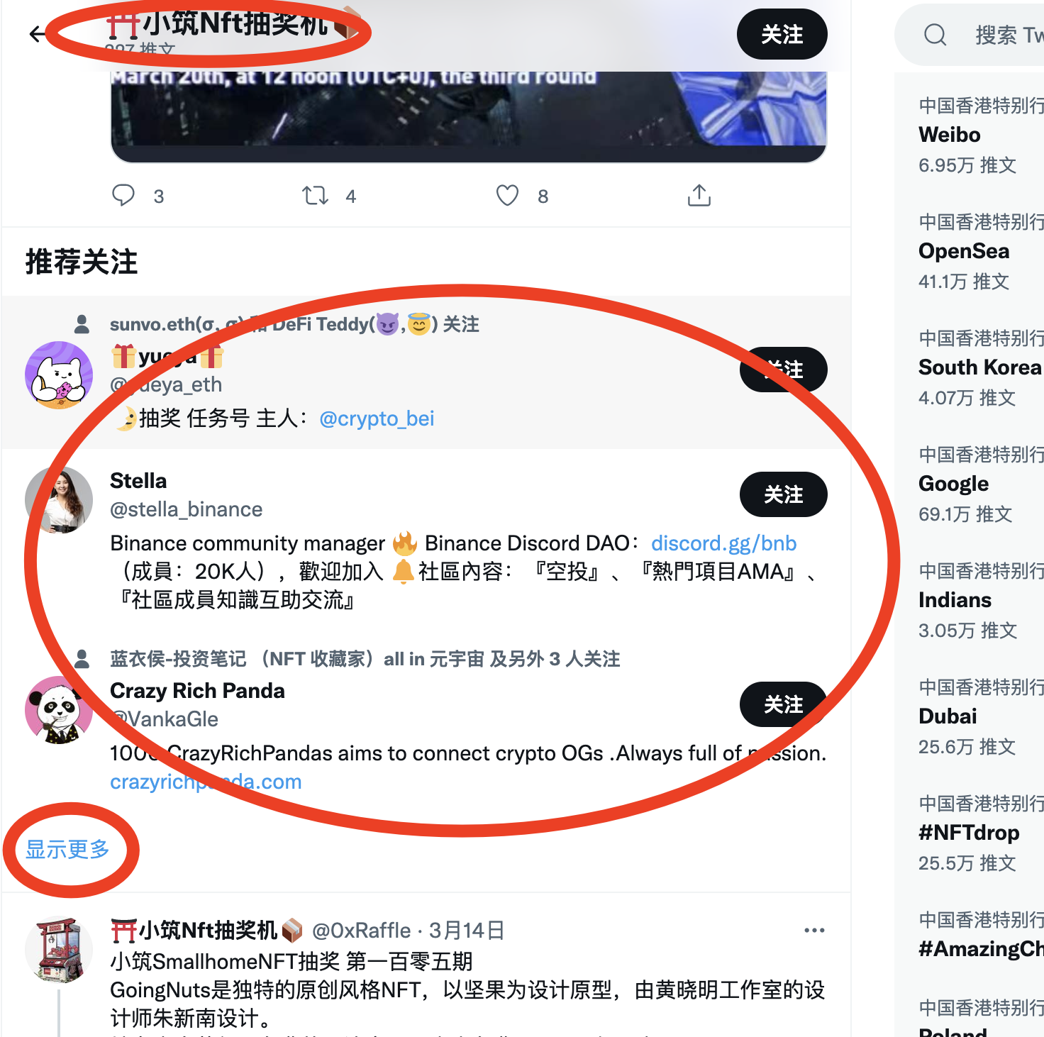 7,添加好以后我们在这位空投博主主页往下浏览,你会发现会有推荐关注,然后点击更多
