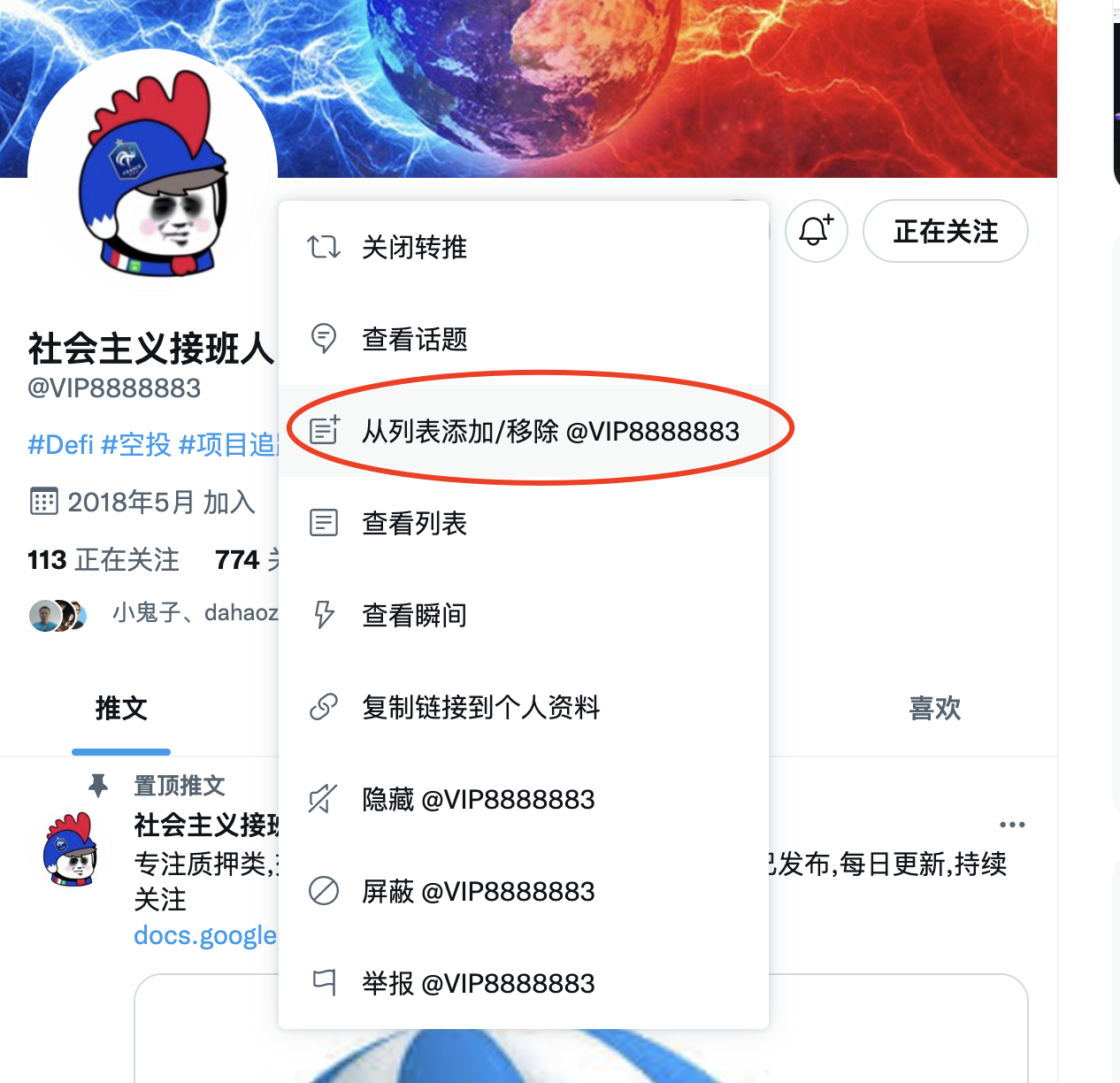 6,如果优质就点击主页,点击主页的三个点,然后从列表中删除或者添加@VIP8888883,到自己已经创建好的列