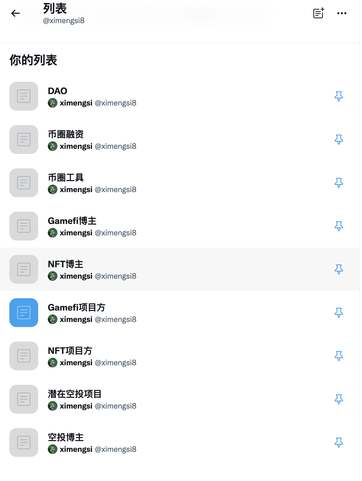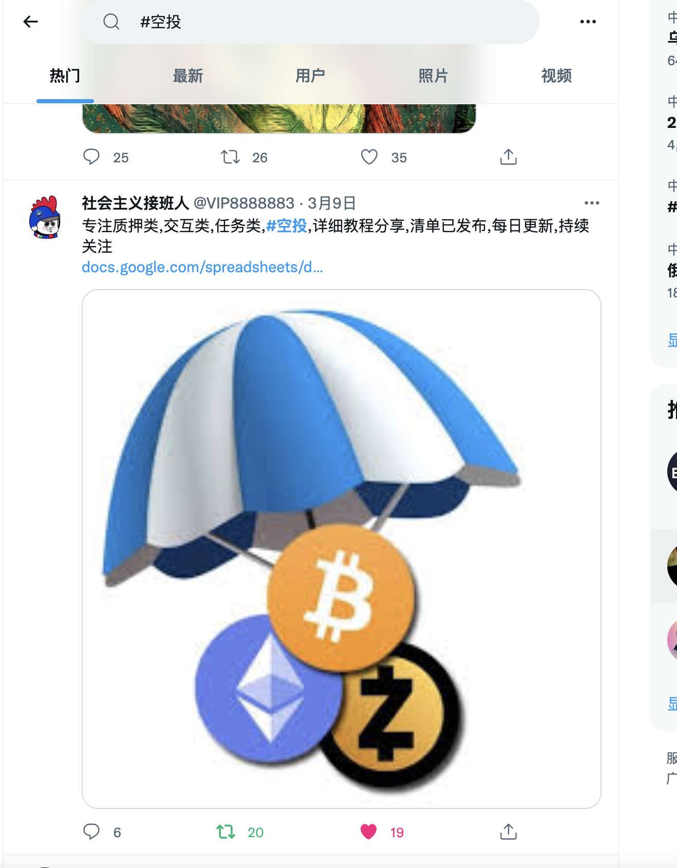 5,创建完所有列表以后,有一些列表你创建时候并没有推送,就要我们去twitter首页搜索页面输入关键词,以 #空投 为例,在首页搜索 #空投 就可以看到全部都是空投博主。随便找一位空投博主点进去,看一下他的内容是否优质