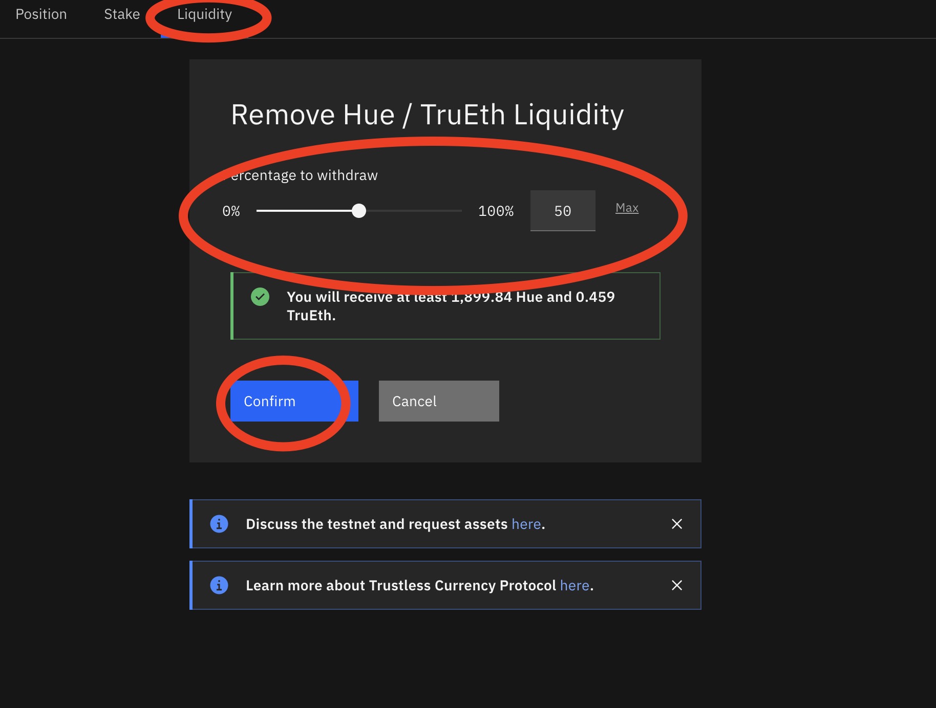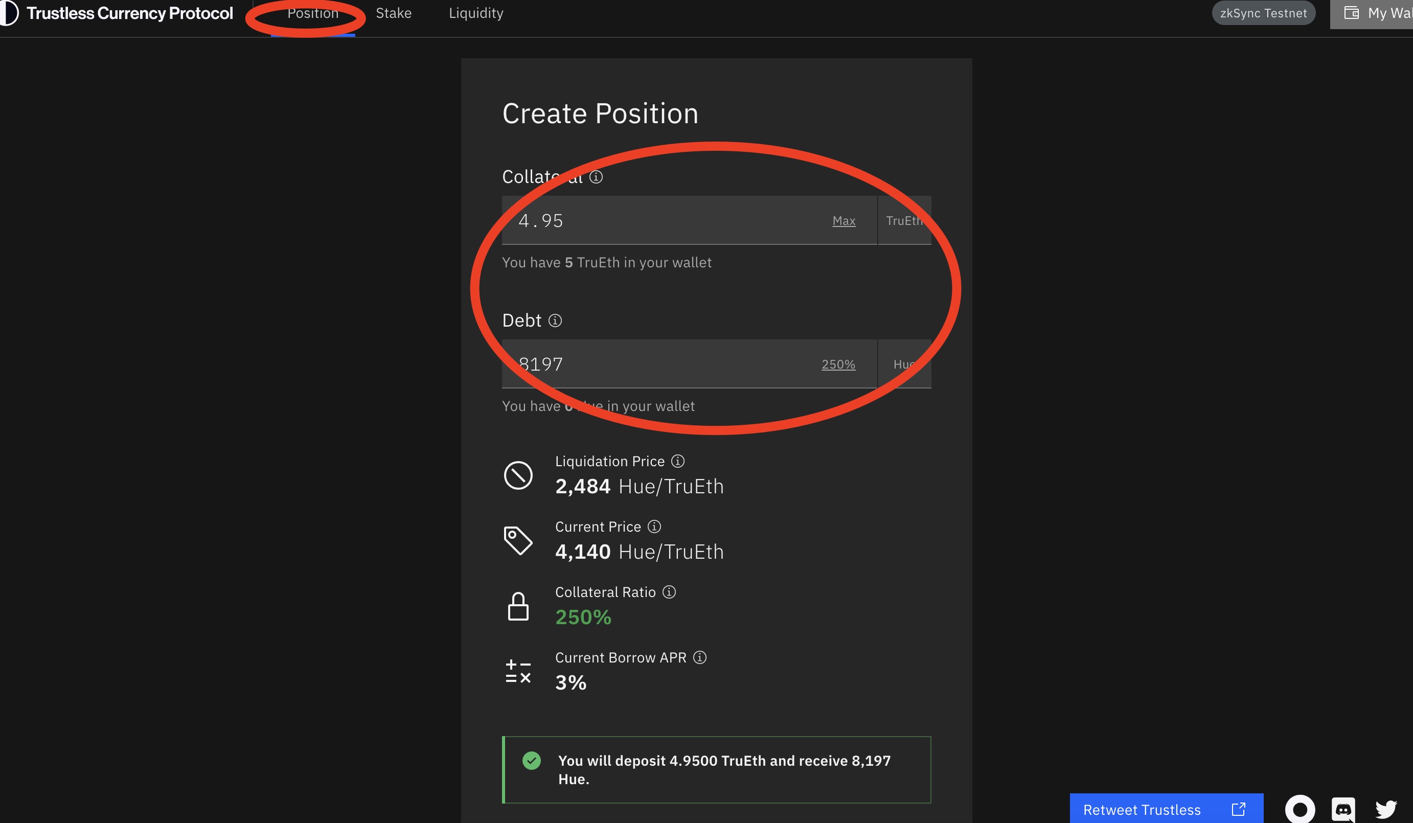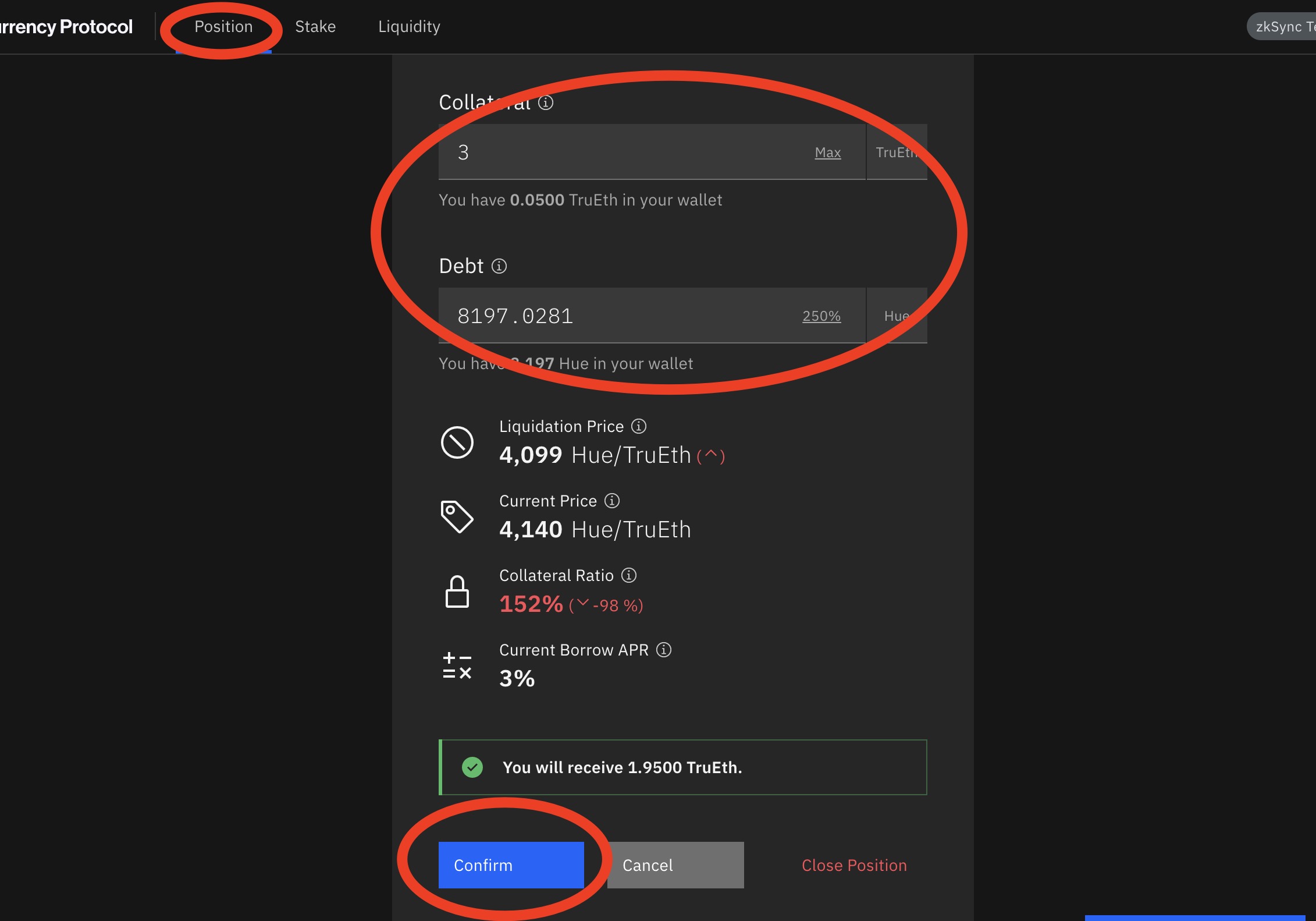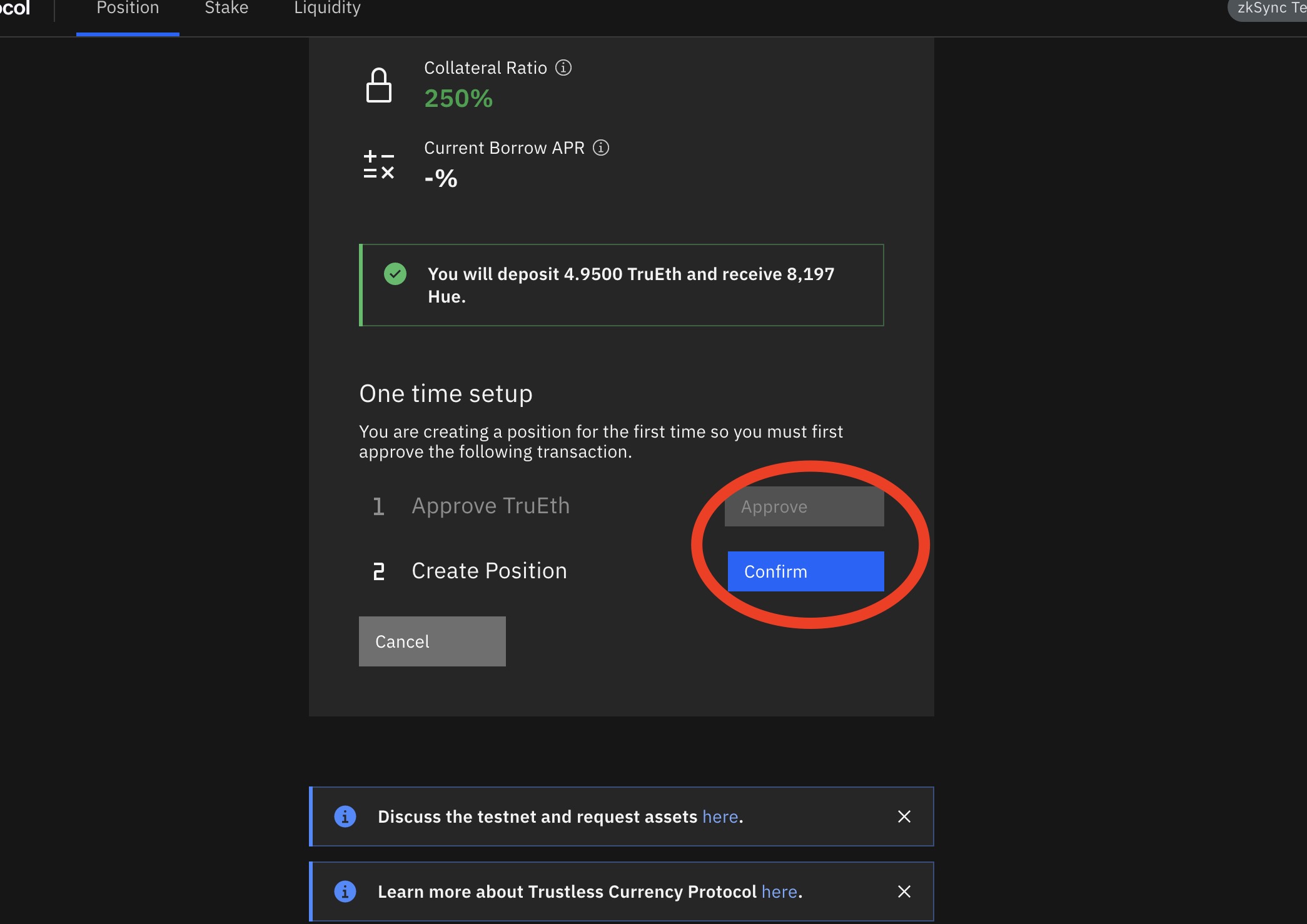 3,测试代币到账以后我们点击位置,输入金额和抵押比率,然后下滑点击批准并确认。