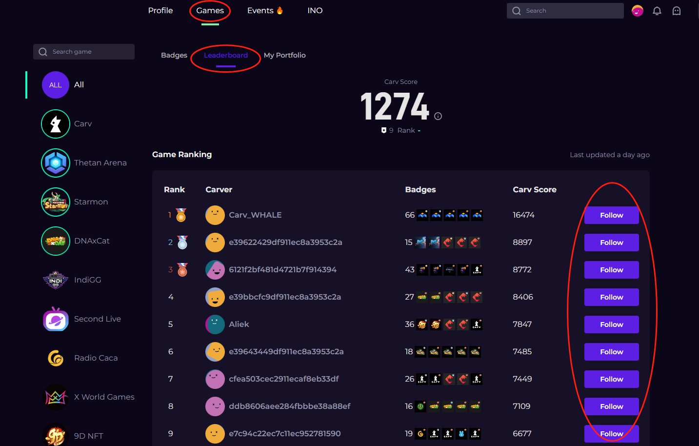 点击排行榜可以看见雕刻分数排名,以及后面有一个Follow,你可以随时关注分数高的用户。分数高的用户就是完成游戏任务最多的用户。