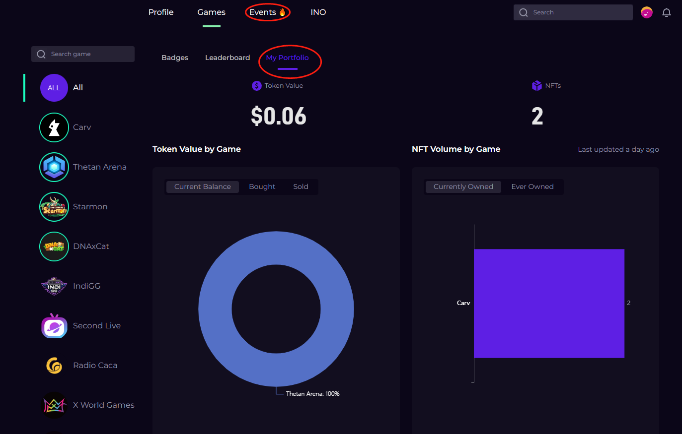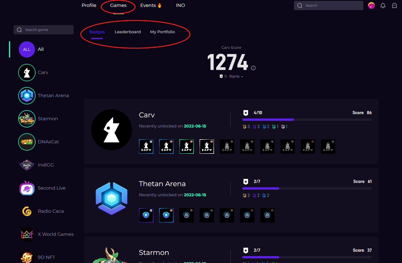 然后我们来到游戏页面,可以看见左面一排全部都是Gamefi,右边是你所得的徽章和徽章雕刻所得的分数。