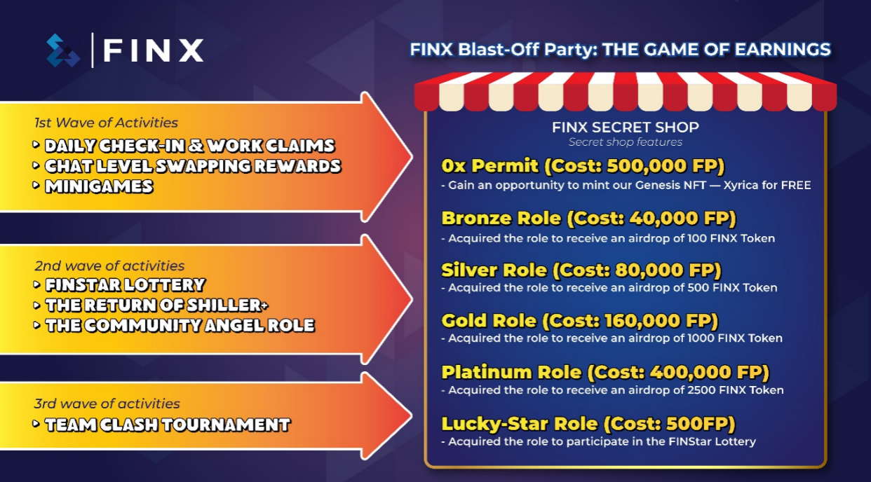 为了提升社群氛围,我们还增加了更多的奖励、更具挑战性的游戏、以及FINX社区的奖励。以下是你可以如何在第二波FINX Blast-Off Party中赚取FP的方法。