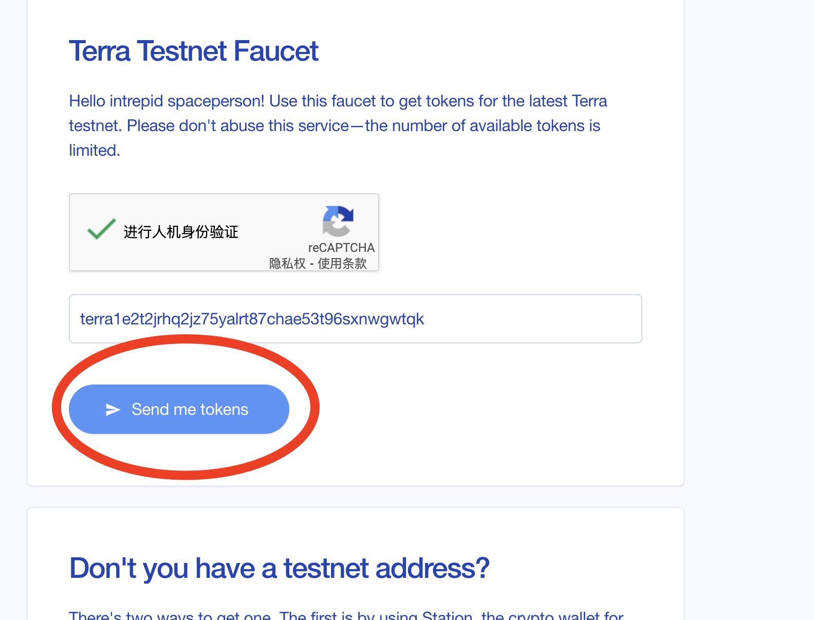3,打开水龙头输入钱包地址并领取测试代币。你会收到5个LUNA到钱包。