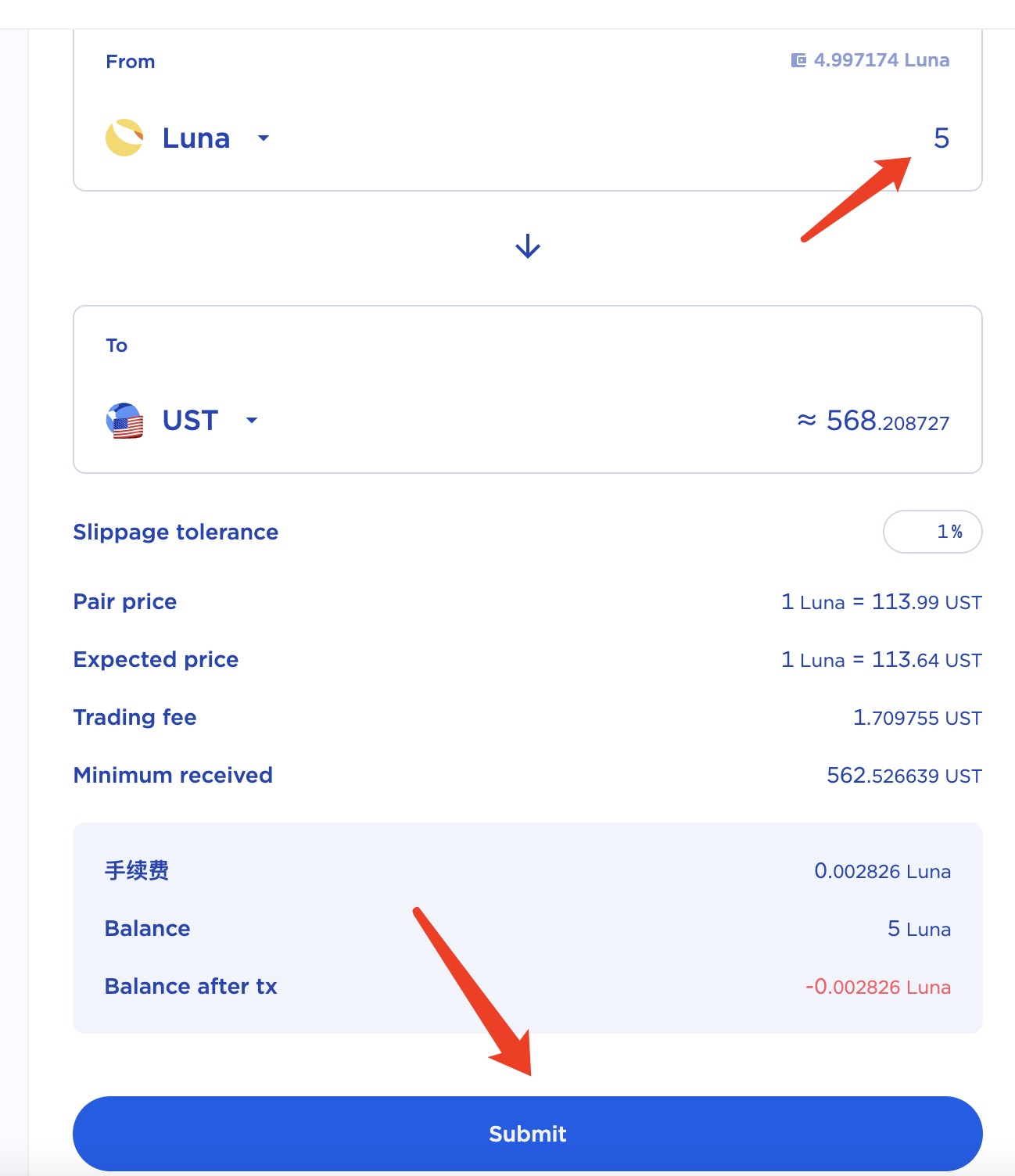 4,打开terra station并连接terra钱包,把领到的5个LUNA代币兑换成UST代币。