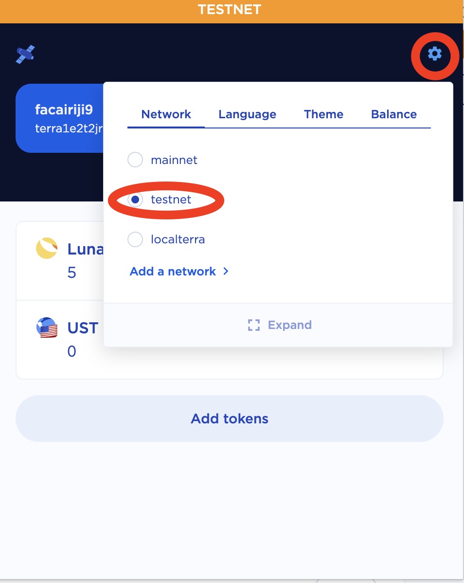 2,创建钱包以后打开钱包,右上角有一个齿轮点击一下,网络切换到testnet。