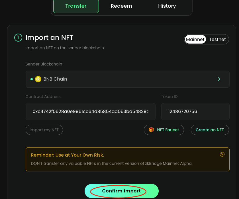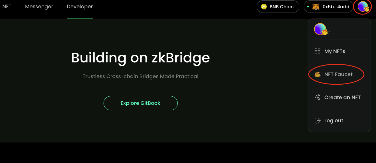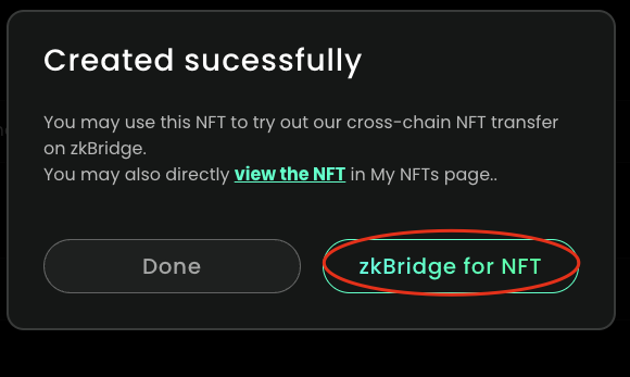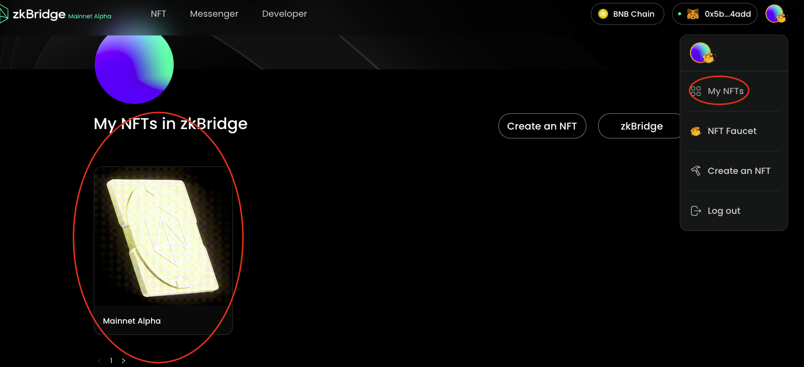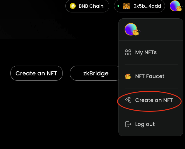 1,打开zkbridge主网并连接metamask钱包切换到BSC主网。点击头像并创建NFT。