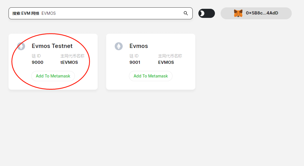 1,打开网络添加工具搜索EVMOS并将测试网添加至metamask钱包的网络中。
