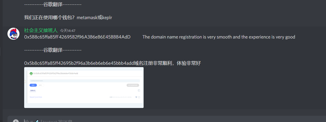 7,我们加入官方discord群,来testnet提交反馈一些问题,并留下自己的metamask钱包地址和截图。也可以反馈一些问题给管理员看看能不能得到一个角色。