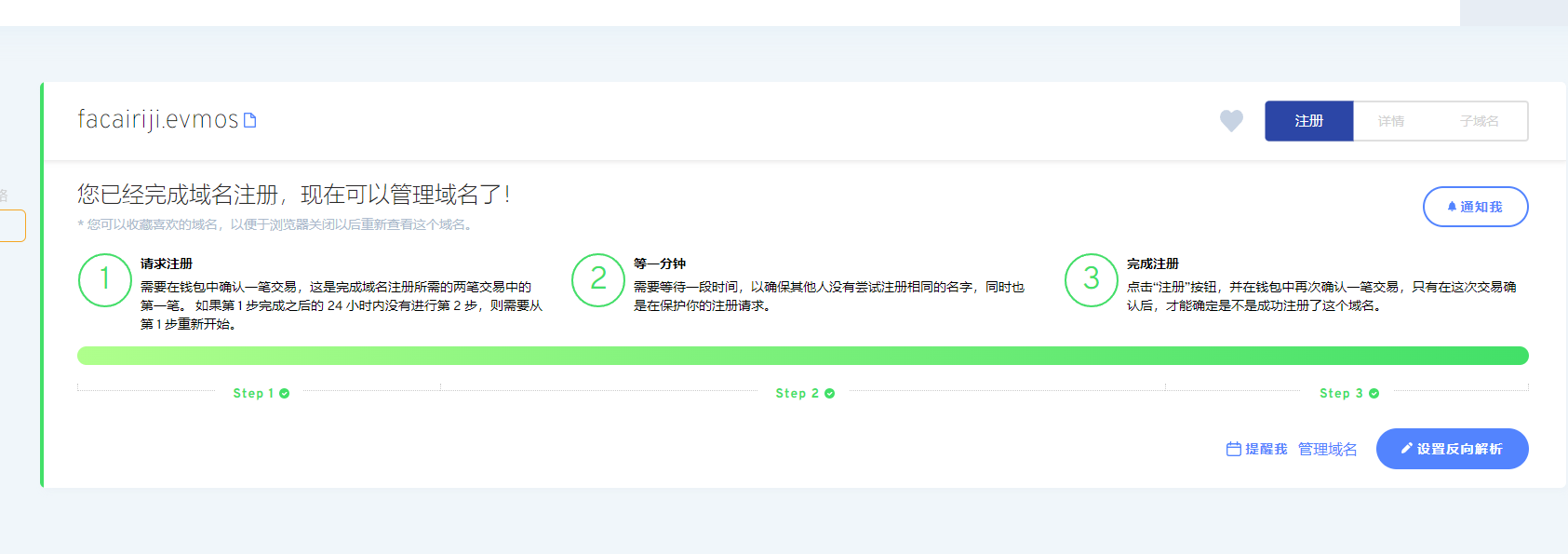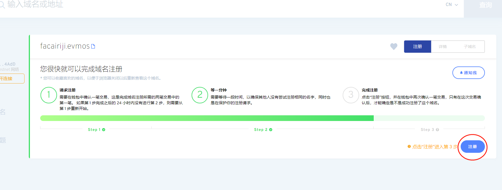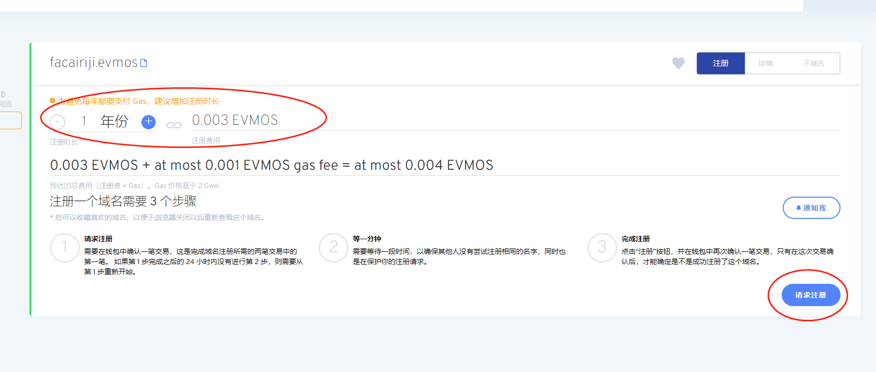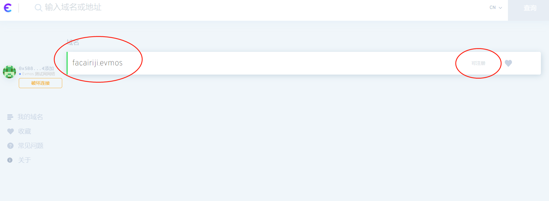4,可以看见我们的facairiji.evmos可以注册,我们点击可注册。