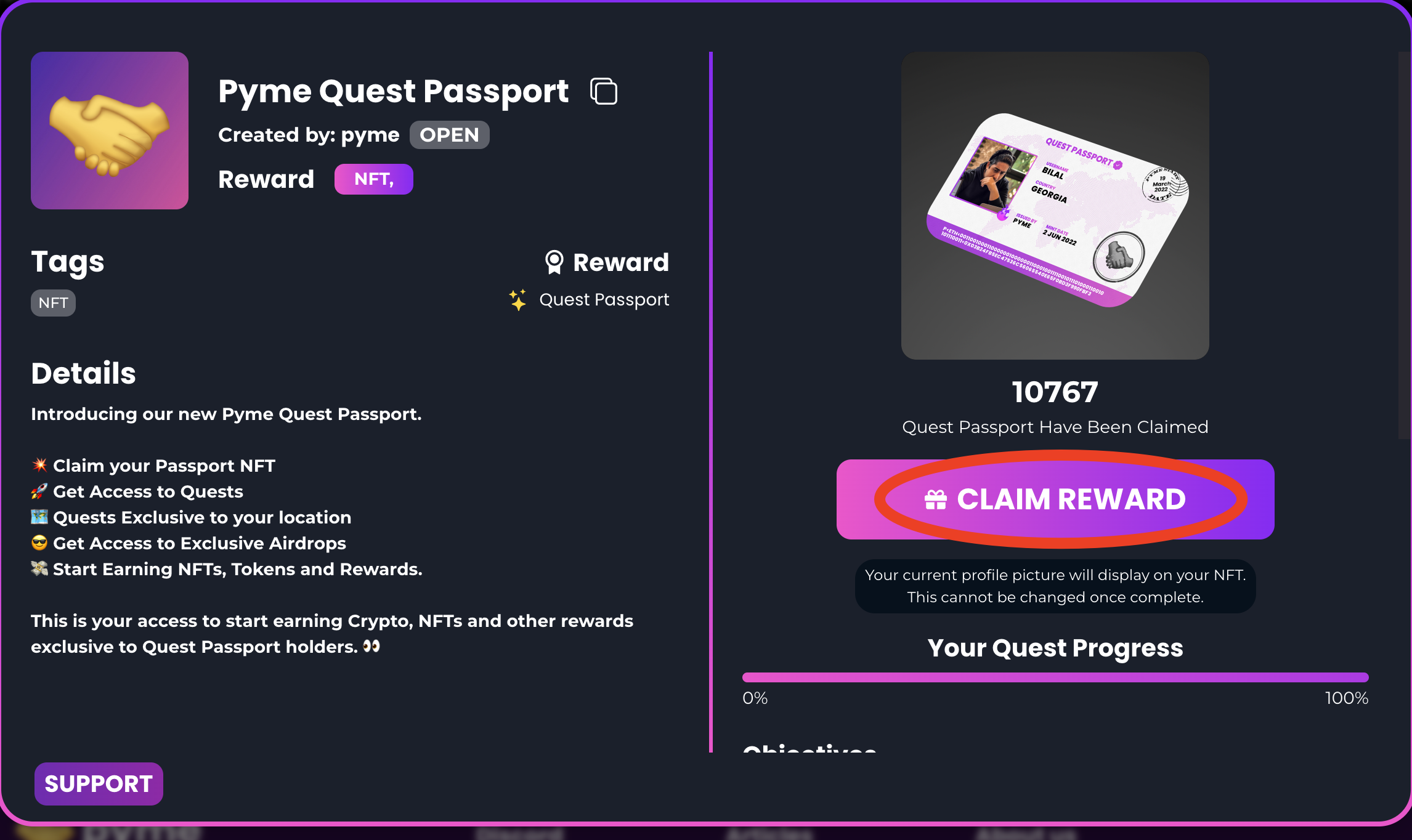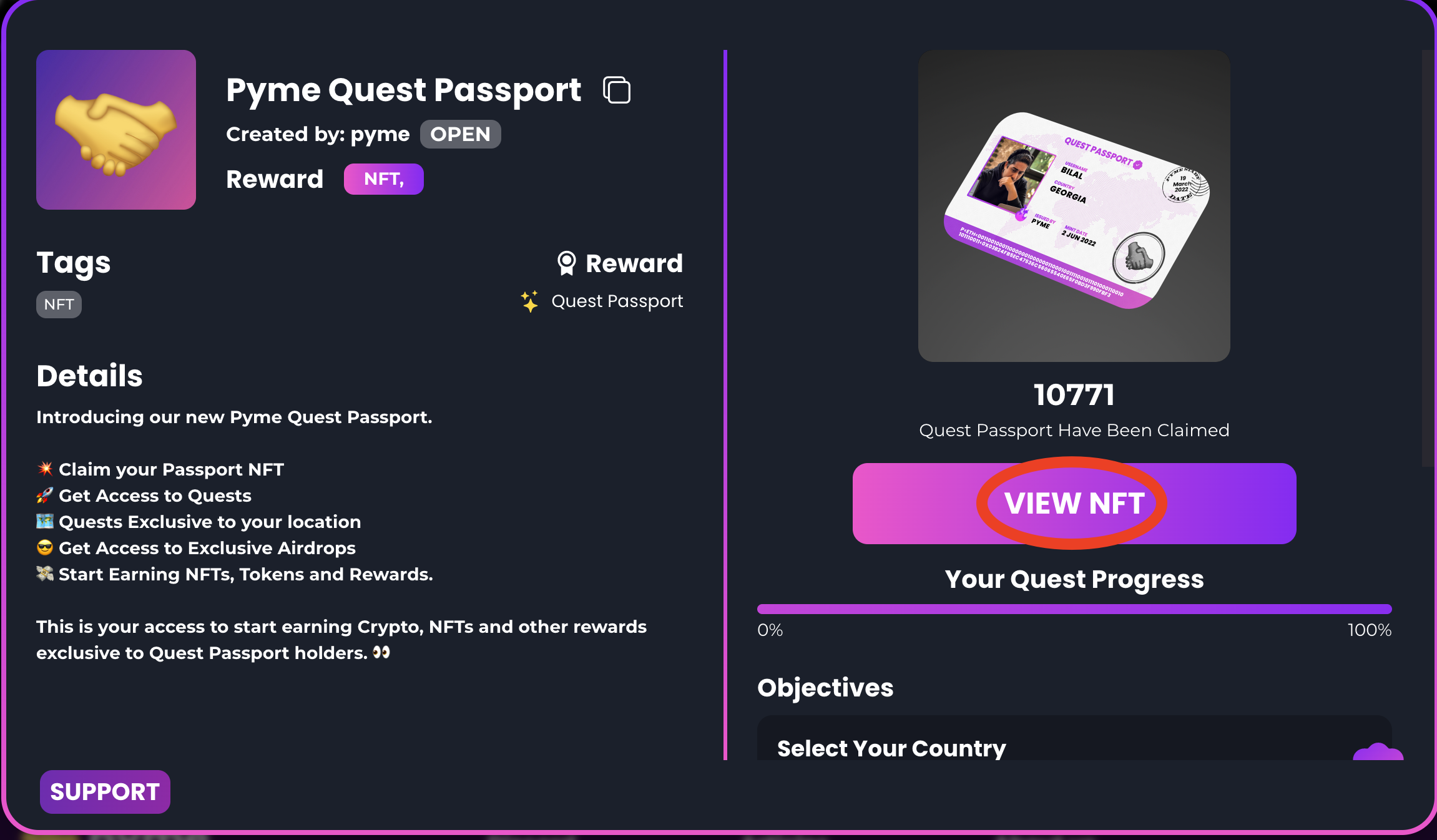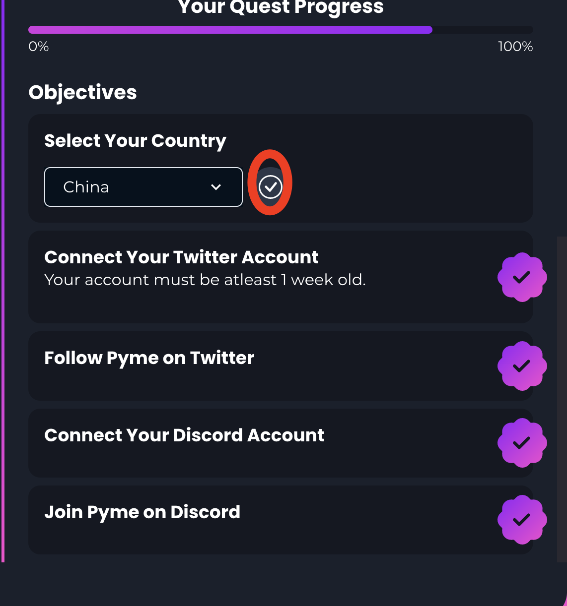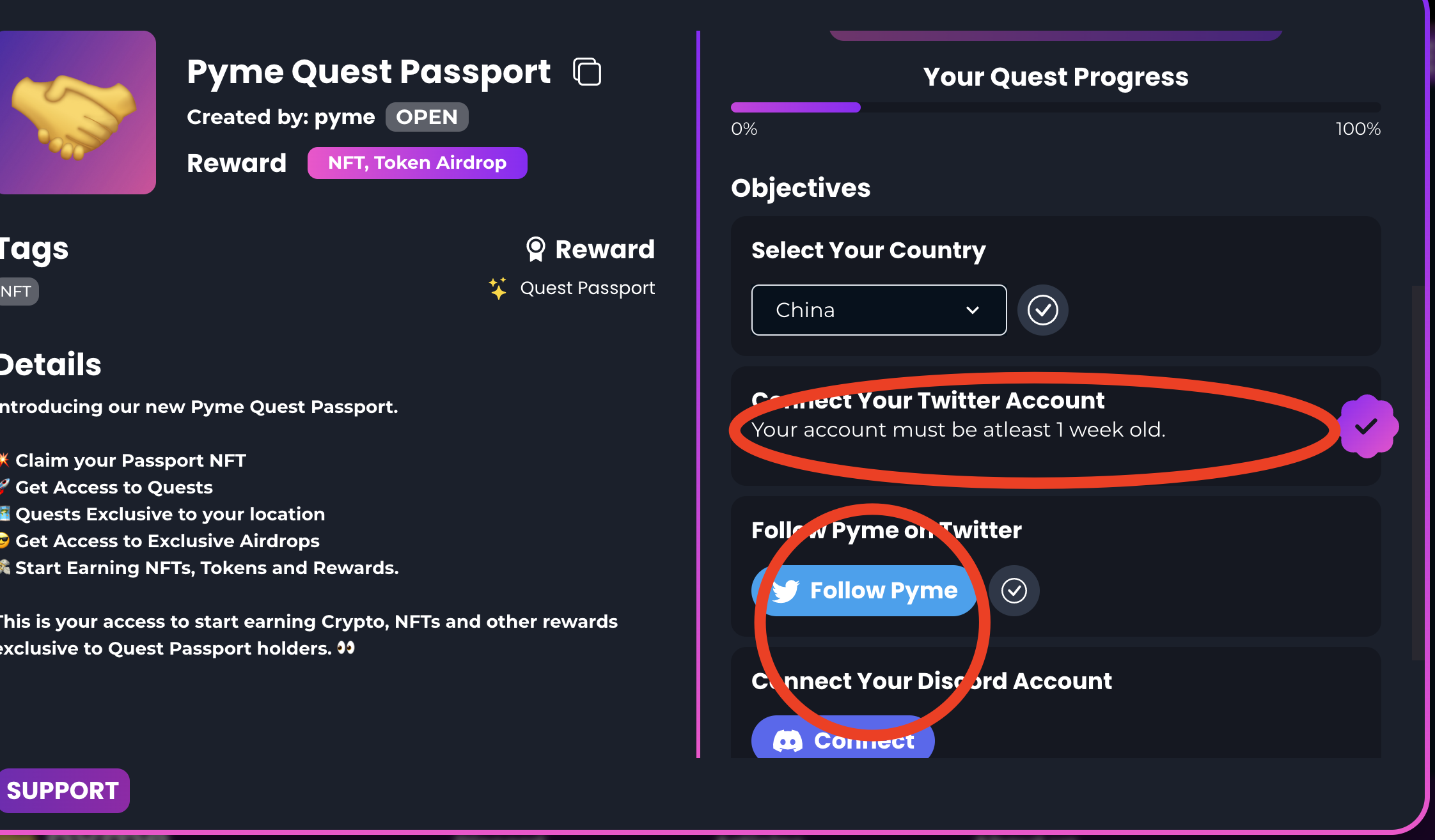 3,第一个任务我们可以看到奖励的NFT,然后任务进度,下滑可以看见所有任务要求,我们按照要求一步一步来完成任务。顺序分别是;选择国家 ,链接twitter,关注twitter,链接discord,加入discord并完成验证。