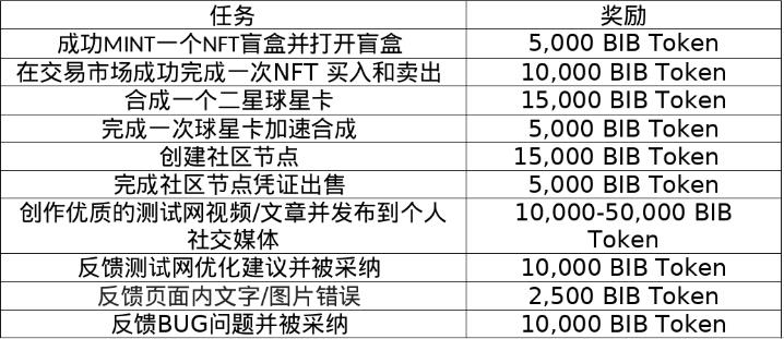 我们很高兴地宣布,我们的激励性测试网现已启动!我们的团队一直在努力达到这一发展阶段,并期待收到用户的反馈。我们启动100,000,000 BIB Token测试网激励计划,通过完成下方对应的活动,可分别获得BIB Token奖励、NFT白名单、USDT奖励等,奖励先到先得,送完即止。测试网活动总共分为3轮,每轮5天,每一轮结束后将清空账号内该轮次NFT卡等相关内容。