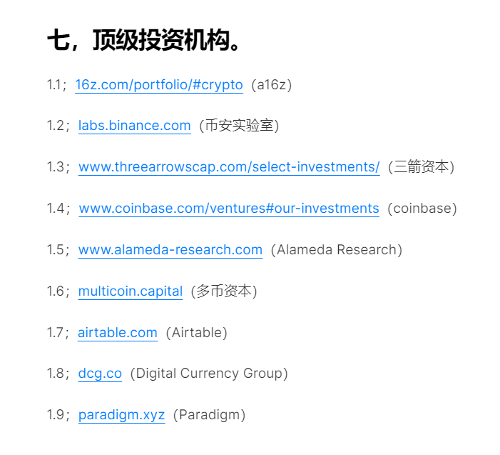 1,项目方的融资以及对币圈所有投资机构的了解,如果有时间精力最好可以整理出来几个有名的投资机构都投过哪些项目,以及有没有发币。再细一些就是再把项目分类整理研究。(在我的币圈必备百宝箱里面有几个投资机构推荐,大家可以自行查找一下)