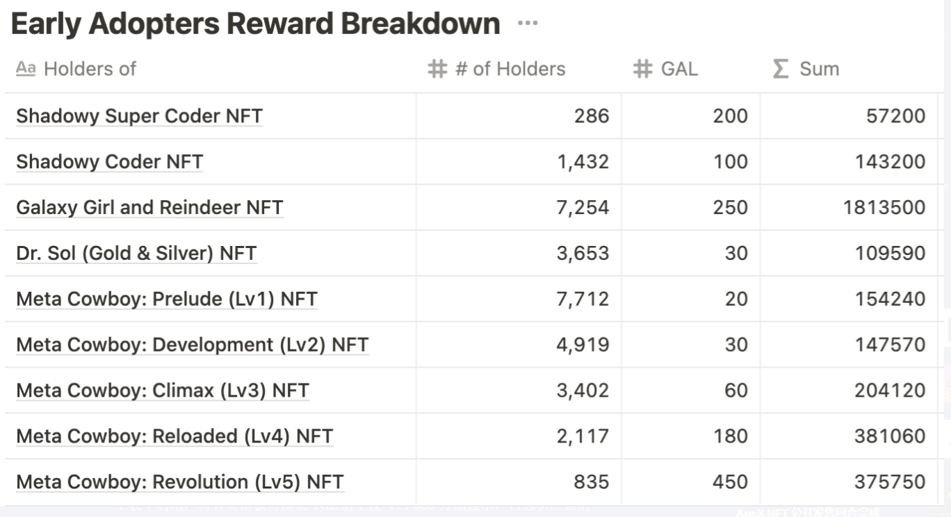 奖励分配系统根据 Galaxy 社区成员持有的 NFT 运行。下面列出的 Galaxy NFT 项目的持有者有资格获得 GAL 早期采用者奖励。如果您在一个账户中持有同一类别的多个 NFT,则该 NFT 只会计算一次。快照将在令牌生成事件前一周拍摄。截至撰写本文时(太平洋标准时间 3 月 17 日晚上 9 点),尚未拍摄快照。代币生成活动的日期待定。