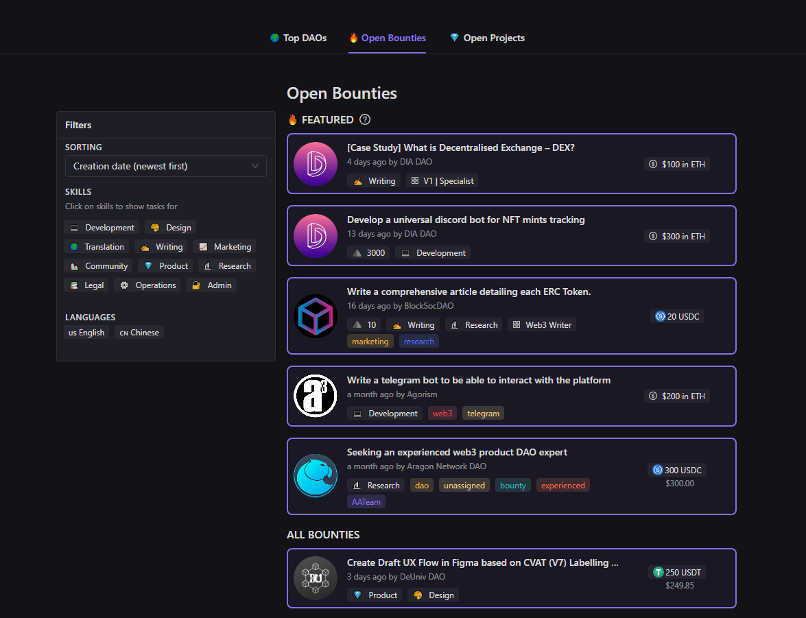 项目简介;具有代币支付、认证、赏金的 Web3 原生项目管理,为贡献者创建赏金,让贡献者建立他们的 web3 个人资料并使用您自己的 DAO 令牌付款。整个流程大体是,DAO首先公布任务,然后平台用户进行申请,最后DAO通过浏览他们的贡献经历来辅助筛选。截至7月5日,Dework平台已支持361个DAO,包括PandaDAO、Nation3、CityDAO等。用户可以通过Discord登录,然后绑定钱包,通过点击“Open Bounties”来查找正在进行的悬赏活动,此外用户还可以根据自己的技能,筛选适合自己的任务,如writing、Research、Translation,同样Dework平台也会根据用户提供的优势技能推荐任务。