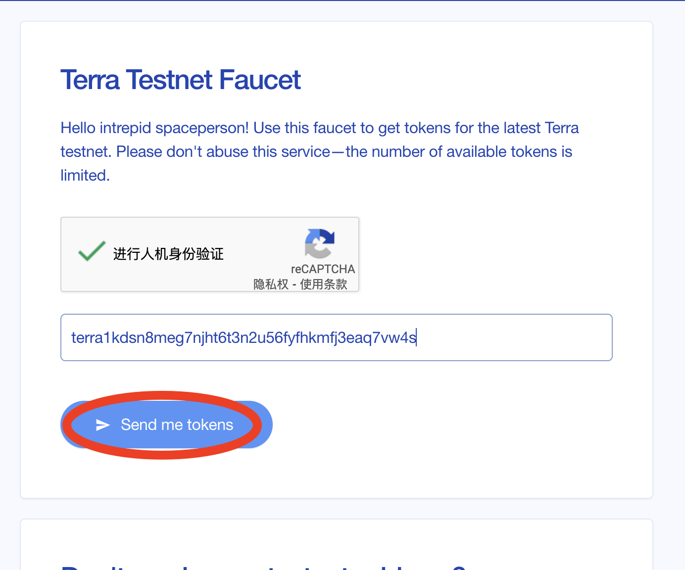 4,打开水龙头地址并输入地址领取测试代币,你会得到5个LUNA。