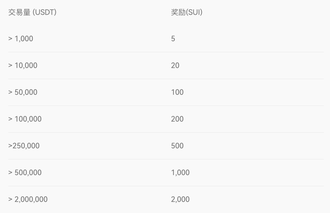 **任务二:**在完成任务一的基础上,参与交易任务,交易越多,奖励越多。交易任务是没有限定交易对的,也就是说交易合约也能算到交易量中,50W的合约交易量,按万四的手续费,手续费也就200U,但奖励是1000个SUI,奖励是有机会涨到1000U的呀,太稳赚不赔了!