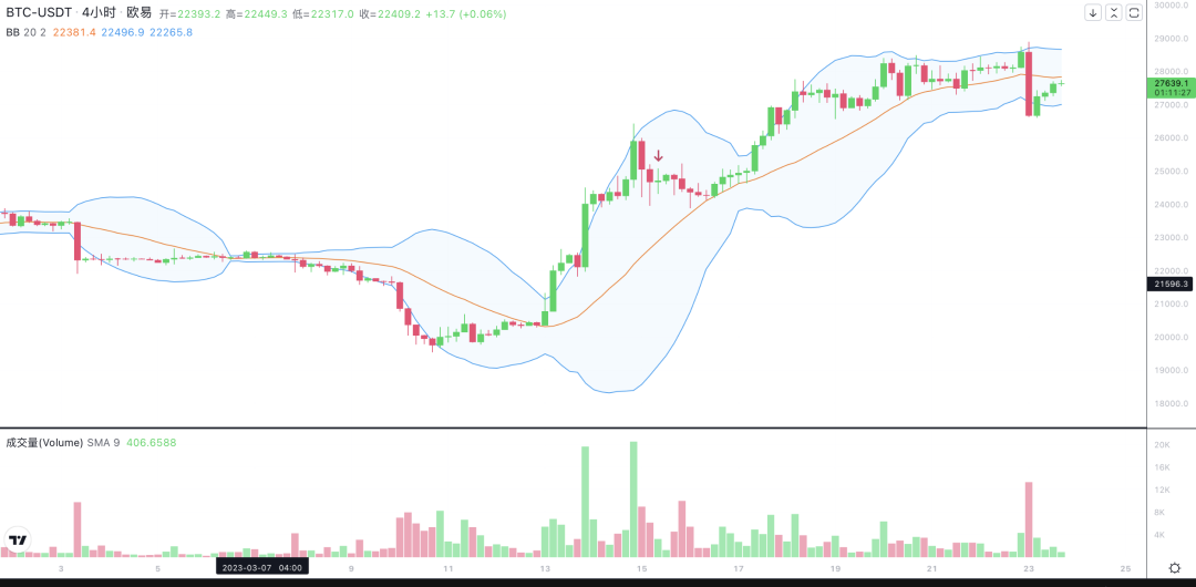 四小时线的布林带上限是28700,下限是27000,分别为阻力位和支撑位。