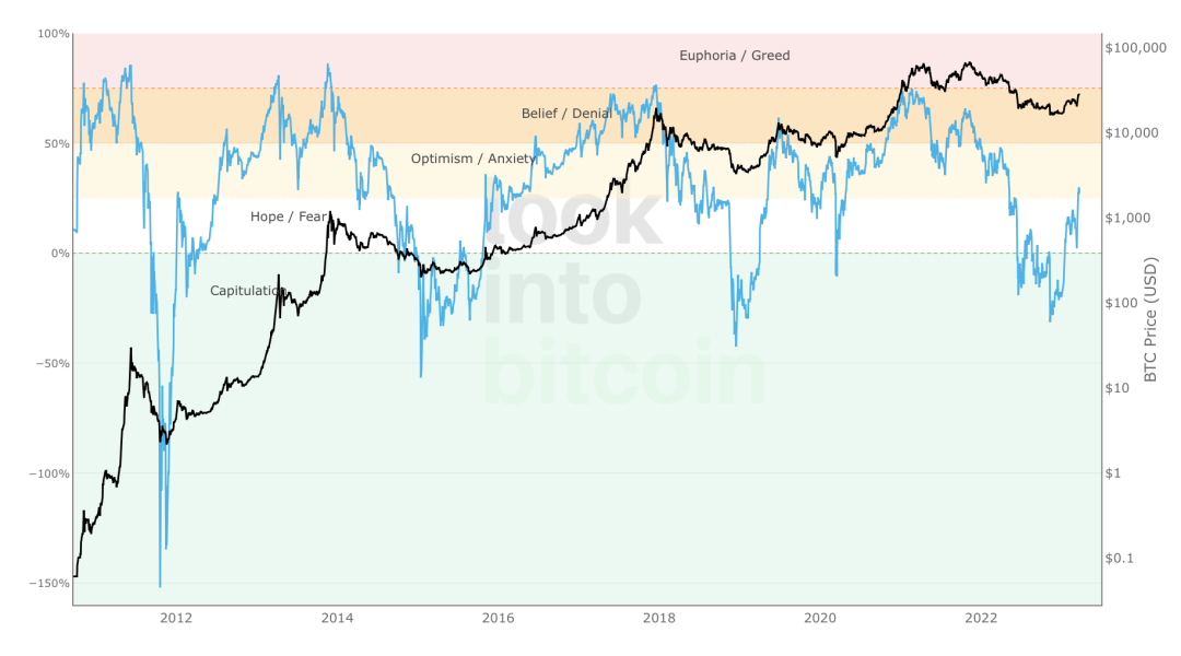 NUPL指数当前约为27%,达到了近期的峰值。这个用于反映代币整体的链上交易盈亏情况,NUPL > 0:链上资金的投资收益处于净盈利状态,NUPL < 0:链上资金的投资收益处于净亏损状态。NUPL 越偏离 0,市场趋势越接近底部或顶部。