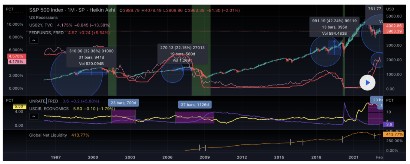 图中粉色线US02Y代表两年期美债收益率,红色线FEDFUNDS代表基准的联邦基金利率,从历史周期看,每当两年期美债利率和联邦基金利率出现倒挂,市场周期就会发生转变。从图中看到,两条线确实在最近展开了纠缠。