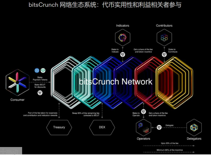 bitsCrunch 代币(“BCUT”)是bitsCrunch 网络的原生实用代币。它的主要功能是促进网络内的顺利运行,并且专门用作实用代币。bitsCrunch 生态系统的安全和高效运作依赖于加密技术和经济激励的融合,旨在促进采用和维护网络安全。代币的核心功能和效用包括: