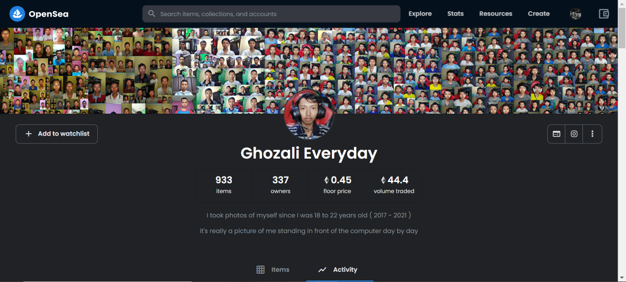 发行这套NFT的创作者,是个来自印尼的18岁小哥名叫Ghozali。小哥天天自拍从18岁拍到22,4年积累933张自拍,他将这些照片当NFT全部发到Opensea上卖,该系列取名为《Ghozali Everyday》。