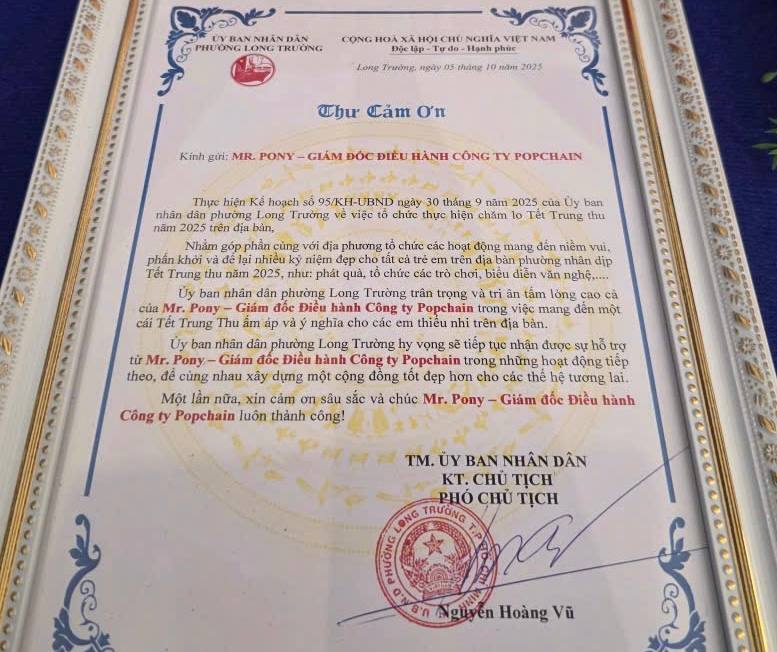 The event was organized by the Long Truong Ward People’s Committee and related local departments, co-hosted and sponsored by Angel City and PopChain.It brought together 1,200 children, distributing 1,200 Mid-Autumn gift packages and 50 excellence scholarships to outstanding students.