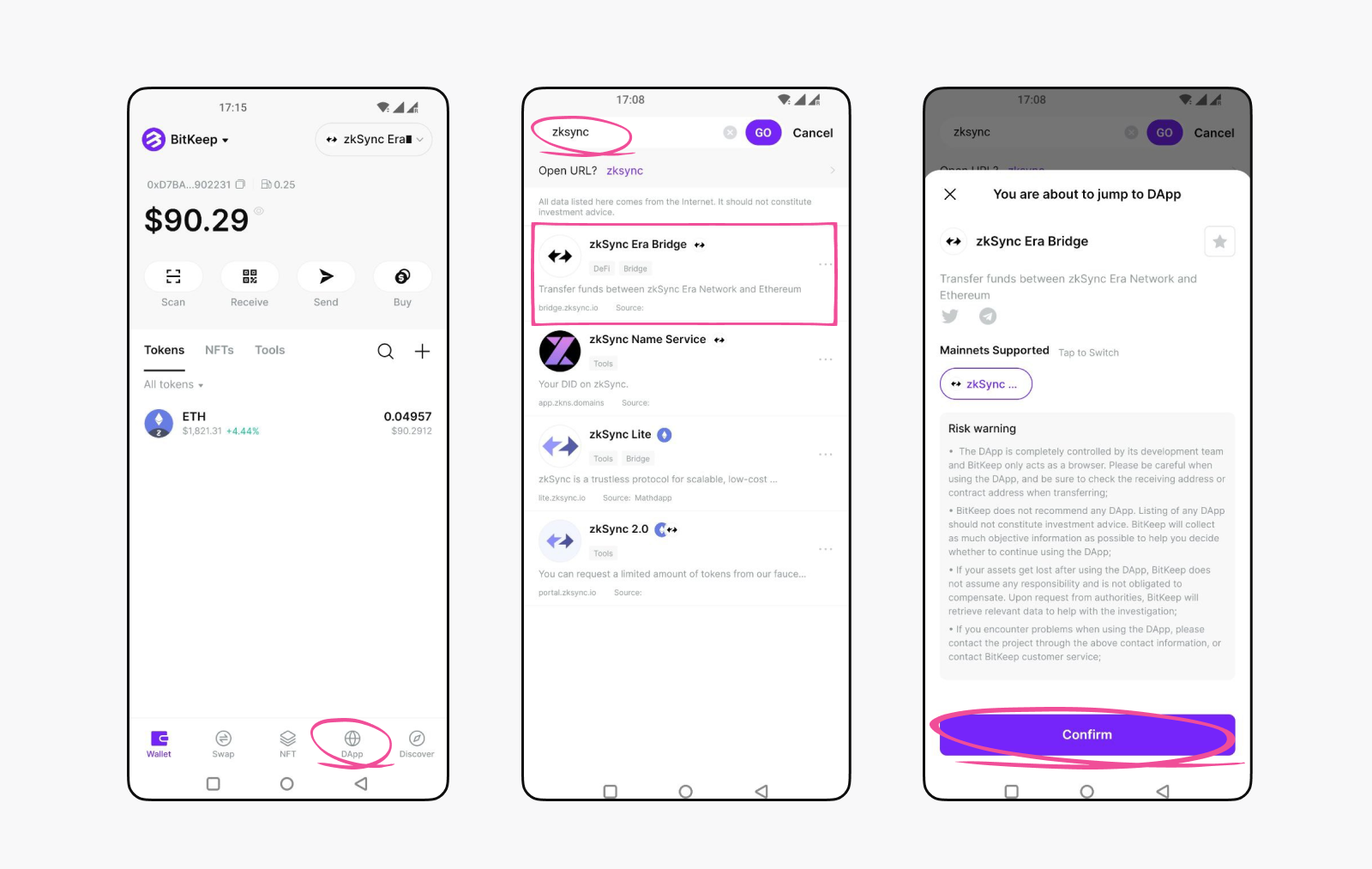 1. Select “DApp” to access the BitKeep DApp browser. Input “zkSync” on the search bar, select “zkSync Era Bridge”, and confirm. The zkSync Era Bridge is the official bridge of zkSync, and using the official bridge is a crucial criterion for airdrop eligibility. You must bridge your funds using the official bridge at least once.