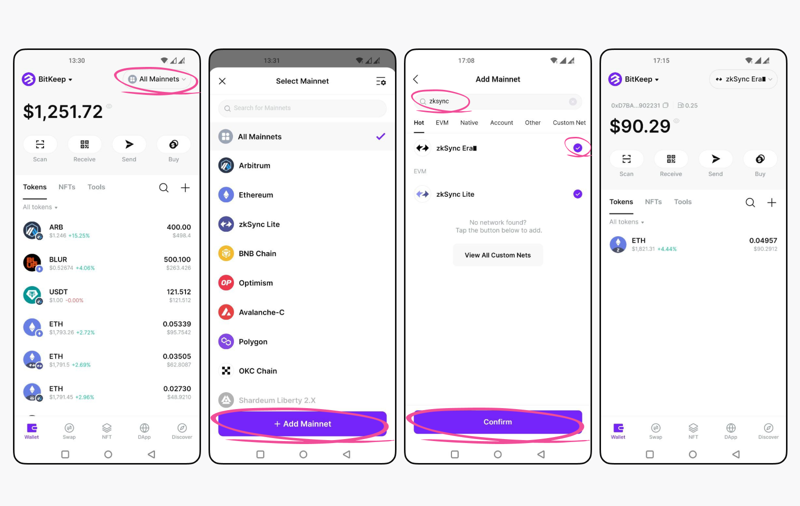 Launch BitKeep Wallet and select "All Mainnets" in the screen’s upper right corner. Tap “+ Add Mainnet” and input “zkSync” on the search bar.