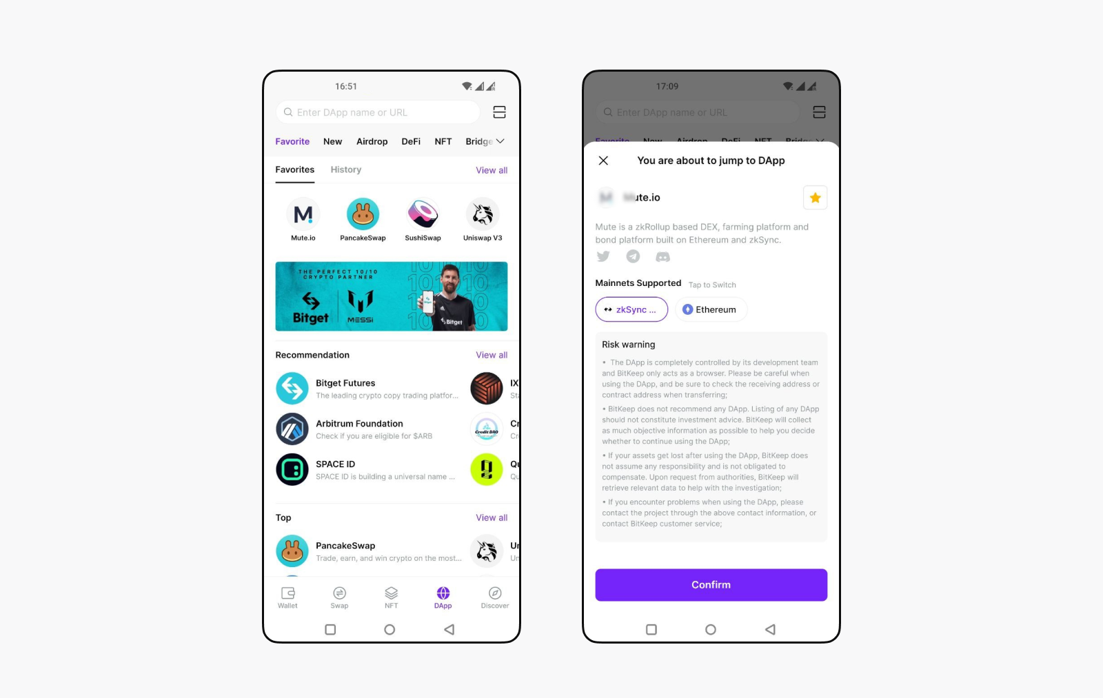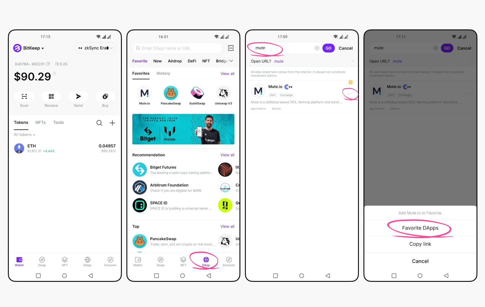 1. Now that we have funds on zkSync Era, it’s time to build up our transaction count, another significant criterion for airdrop eligibility. Select “DApp” to access the BitKeep DApp browser. Input “mute” on the search bar and tap the option (three dots) to add “Mute.io” to your favorite list.