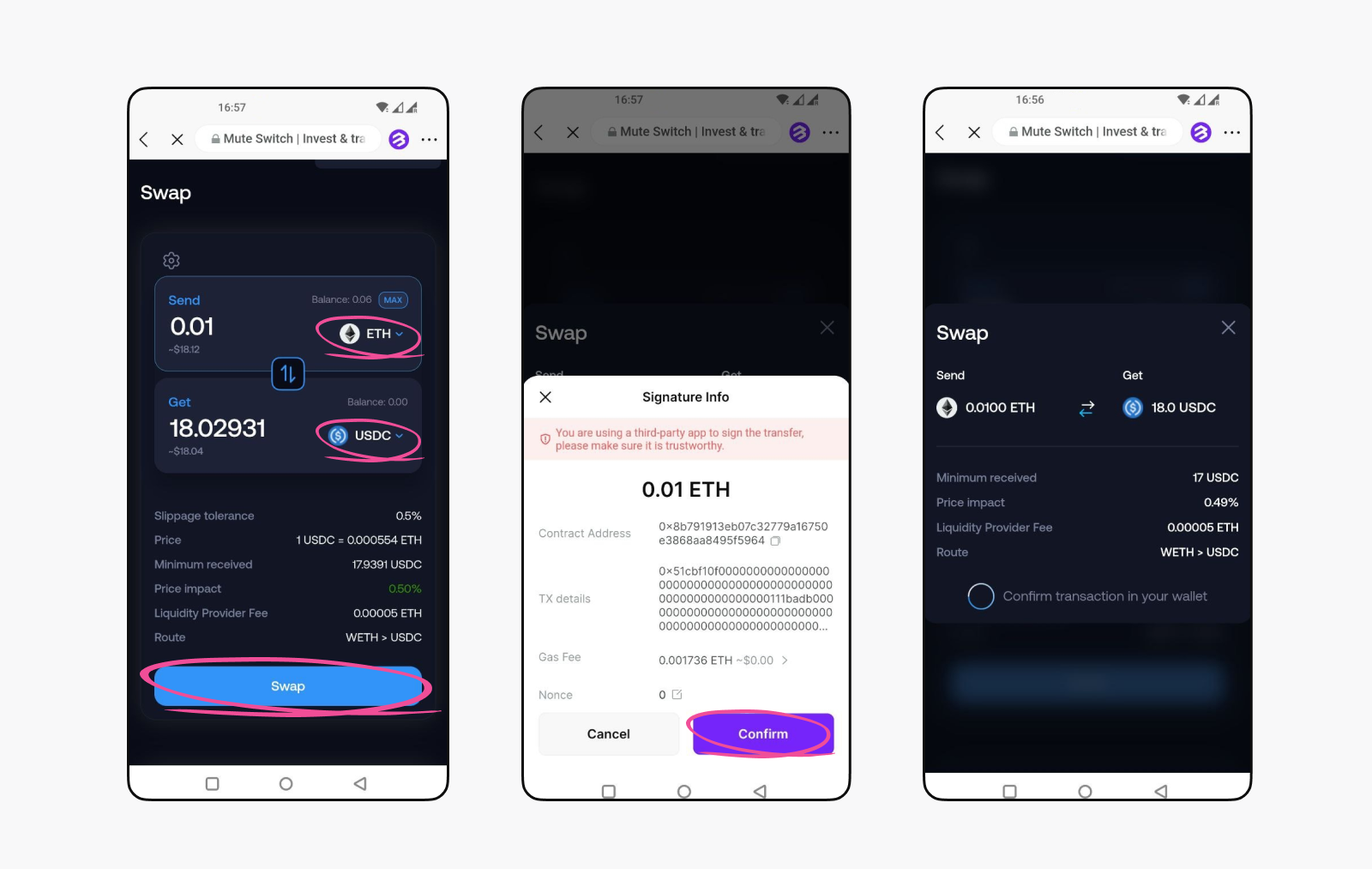 3. The BitKeep wallet will be automatically connected to the DApp. Enter the amount and choose the type of token (e.g., USDC) you want to swap into. I recommend swapping 0.01 ETH just to build up the transaction count. Tap "Swap" and confirm. You will receive push notifications from BitKeep once the transaction is completed.