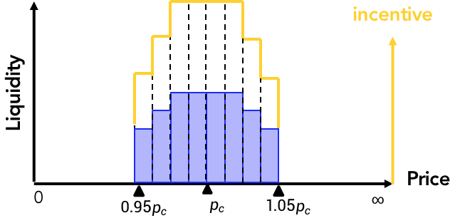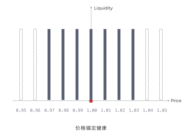 当系统检测到价格连续上升,偏离1美元时,流动性向低价倾斜,减少高价区间流动性; 当系统检测到价格连续下降时,流动性向高价倾斜,减少低价区间流动性;