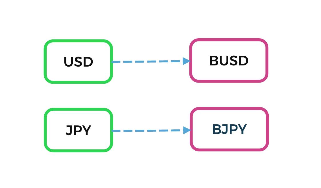 BenFen chain会映射多种国家的法币作为稳定币,例如美元USD、日元JPY等,上文所说的BUSD 就是 USD映射在BenFen chain上的美元稳定币,以此类推JPY为BJPY,映射到BenFen chain上的代币价格与之相应的法币锚定。
