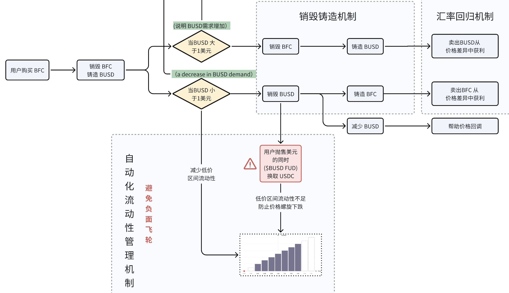 在这样的机制下,能有效预防因市场剧烈波动而带来的超买/超卖行为,从而给价格回锚争取时间。如下图所示,当BUSD脱锚 低于1美元时,用户可能会因为恐慌大量抛售BUSD换回USDC,此时若不对流动性加以影响,也许会再次遇到luna的悲剧,而自动化流动性管理可以有效引导价格回锚,给铸造和套利者争取时间,帮助价格回调。