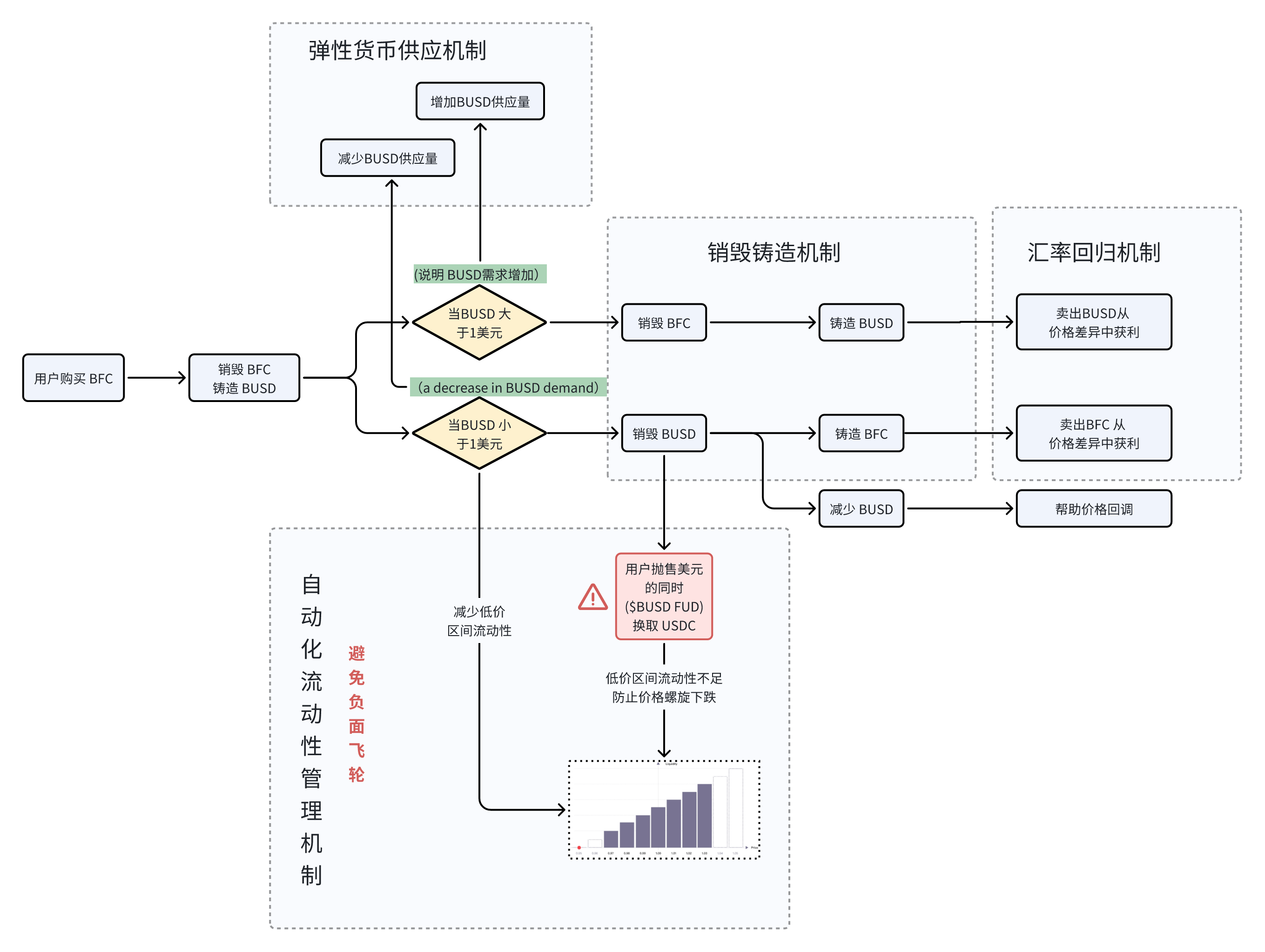 BenFen 设计了弹性货币供应机制,根据市场需求的波动自适应扩张与收缩BUSD的流通量,防止价格波动过大。