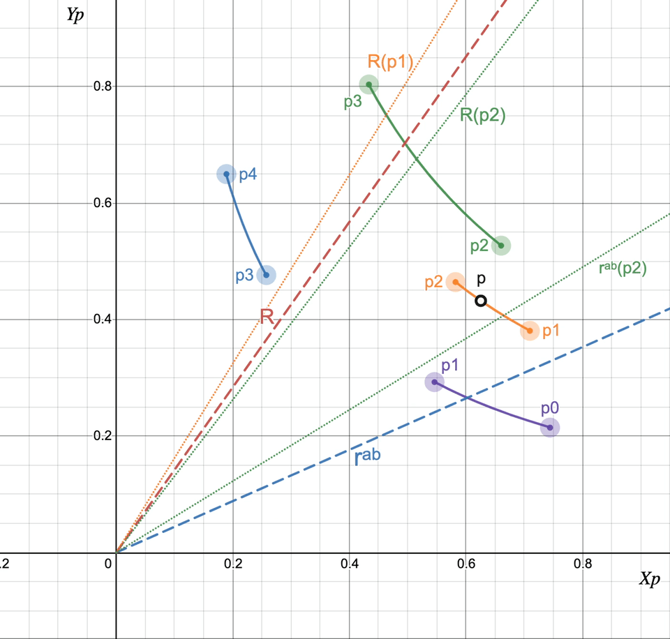 uniswap v3鼓励用户向市场价附近提供流动性。在上图中,横纵坐标分别是交易对中两个token的价格,每一条彩色弧线代表一个用户的流动性提供区间,图中的四条弧线正好将p0到p4这段价格区间完全覆盖。
