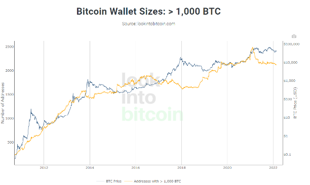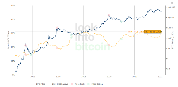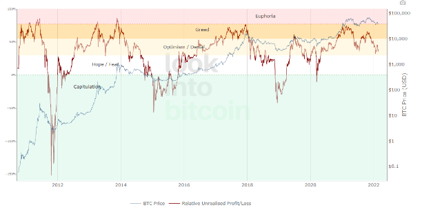 在2013年和2017年的兩次牛市見頂時,該指標分別是237%、134%。本輪牛市,比特幣漲至4.7萬美元的時候,該指標最高達到108%,繼續漲到6.4萬美元的時候,該指標反而降到了34%。目前,該指標為-17.7%。