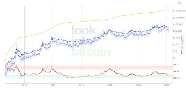 在信心高而價格低時(綠色區域)投資比特幣具有較高的風險回報;反之,在信心低而價格高時(紅色區域)投資比特幣將產生虧損。